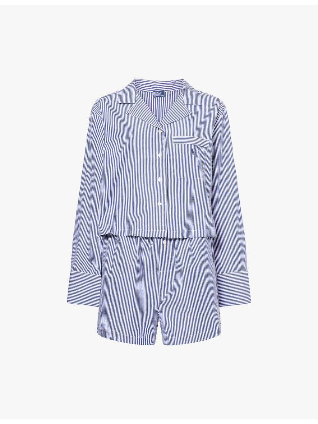 PRODUCT DETAILS - Polo Ralph Lauren cotton pyjama set - 100% cotton - Button fastening - Top: Relaxed fit, collar, long sleeves, buttoned cuffs, patch pocket at chest, logo embroidery at chest, stripe pattern, cropped length - Bottom: Regular fit, mid-rise, elasticated waistband, boxer style, logo embroidery at front, slip pockets, stripe pattern - Machine wash cold - True to size - Model is 5ft 10in/1.78m and wears a size small - Lightweight, non-stretch Ref: R04537095