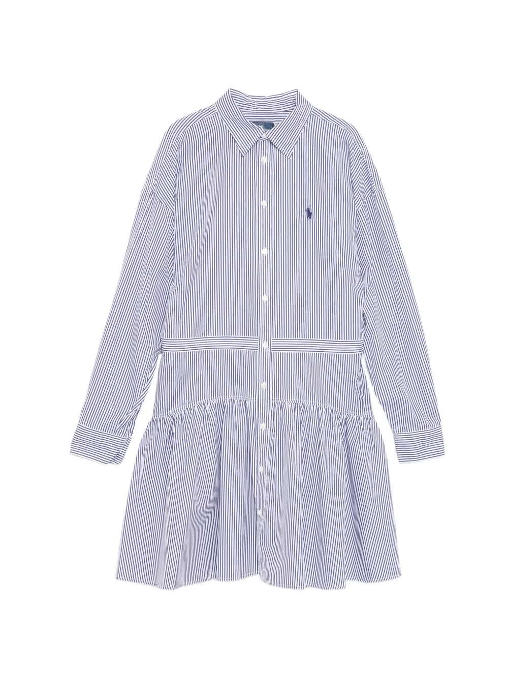 striped ruffle midi shirt dress Highlights - Blue/white - Front button fastening - Long sleeves - Drop waist - Point collar Imported Composition Cotton 100% Washing instructions Machine Wash