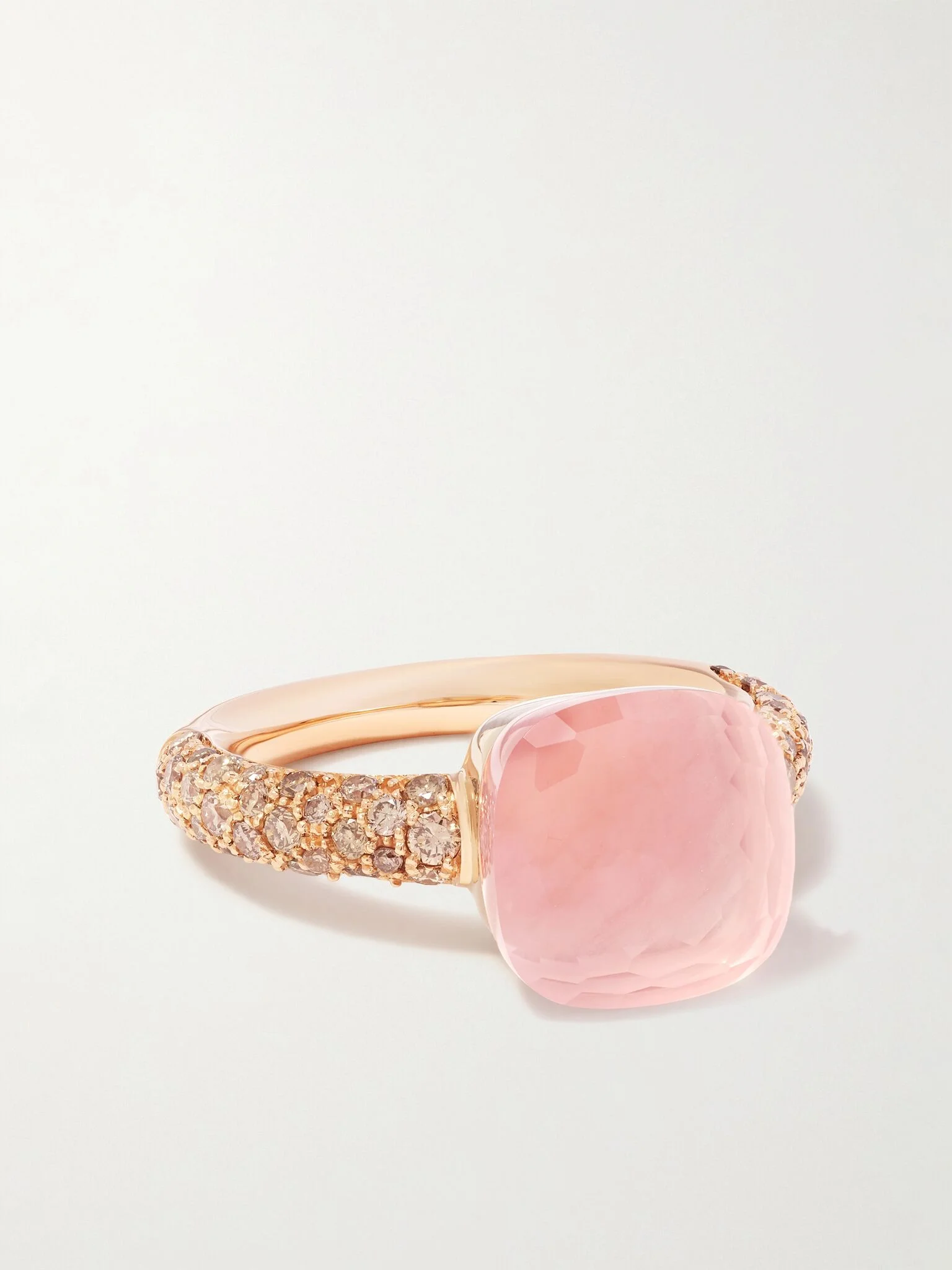 The transformative power of color is at the heart of Pomellato's 'Nudo' collection. Handmade from 18-karat rose gold, this ring features a combination of chalcedony and captivating rose quartz – a stone thought to communicate love, making it the perfect gift. The band is encrusted with 58 shimmering brown diamonds. Size & Fit - French sizing - Measurements can be found in the link below Details & Care - Rose quartz; chalcedony; brown diamonds, total weight: 0.70-carats - Comes in a designer-stamped box