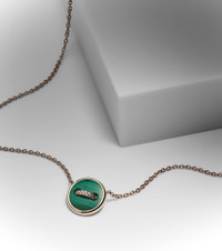 Product Details - Material: 18kt rose gold, mother-of-pearl - Made in Italy - Stone I: malachite, round-cut, bezel setting - Stone I carat total weight (ctw): 2.3 - Stone II: white diamonds, brilliant-cut, pave setting - Stone II carat total weight (ctw): 0.05 - Closure: lobster-clasp fastening - Includes: box - Item number: P00960729 Size & Fit - Adjustable length - Width 1mm-0.05" - Pendant length 14mm-0.55" - Pendant width 15mm-0.6" - Min. length 38,5cm-15" - Max. length 42,5cm-16.5"