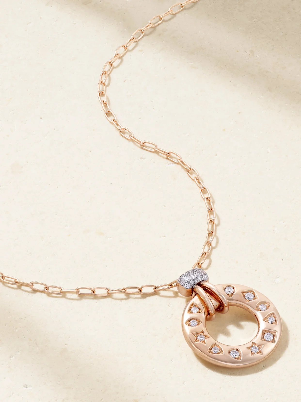 Pomellato's necklace is from the label's 'Iconica' collection that "fuses Milanese tradition and contemporary elegance". Handmade from 18-karat rose gold, it's strung with a ring pendant that features 11 round-cut diamonds in a variety of different settings. The bar-shaped link above it is plated in white rhodium to ensure the stones shine beautifully. Adjust the length to your preferred drop.
