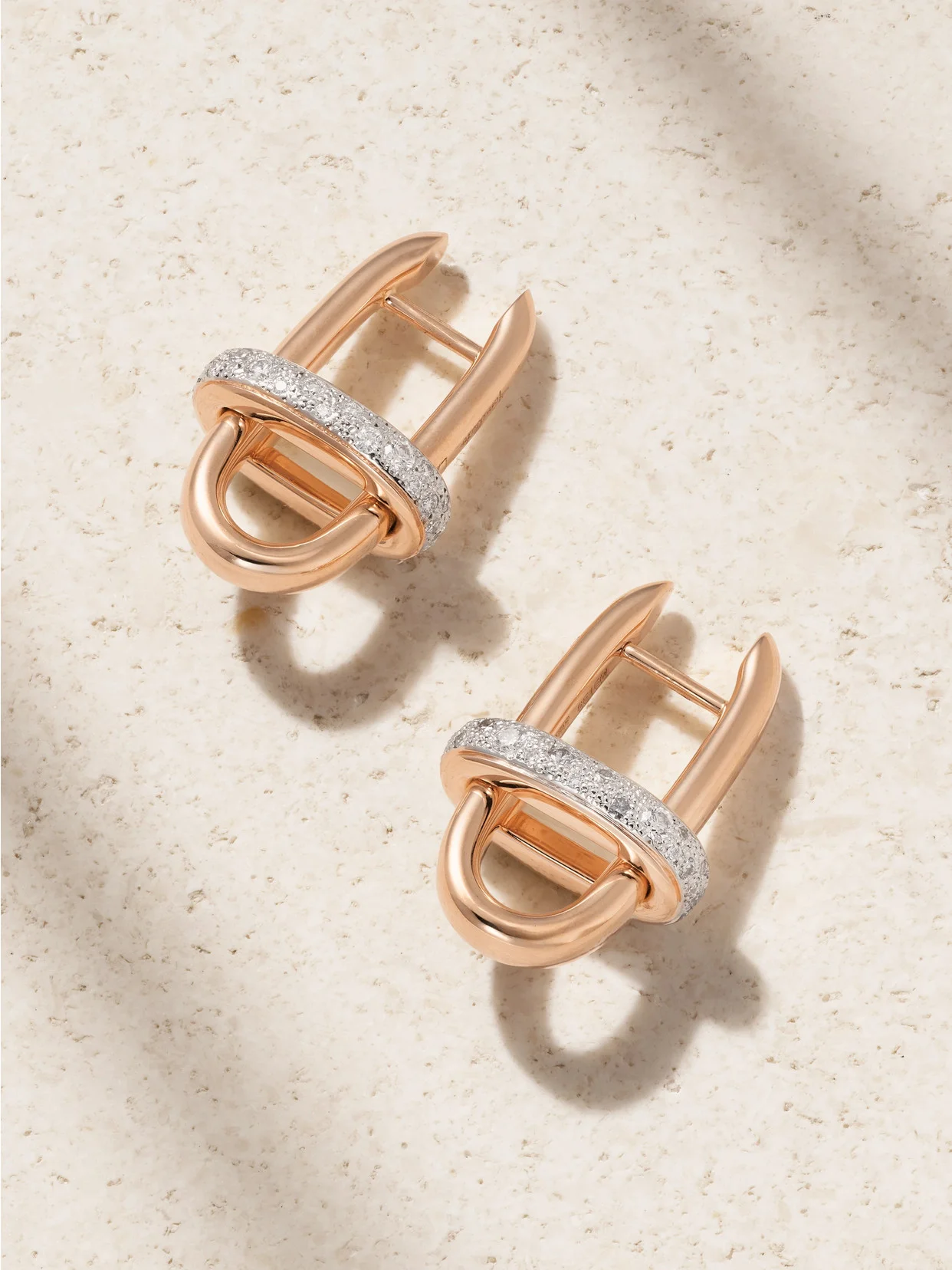 Pomellato's 'Iconica' earrings have been handmade in Italy from 18-karat rose gold in a modern, streamlined shape inspired by chain links. They feature a white rhodium-plated band encrusted with 0.60-carats of shimmering diamonds.