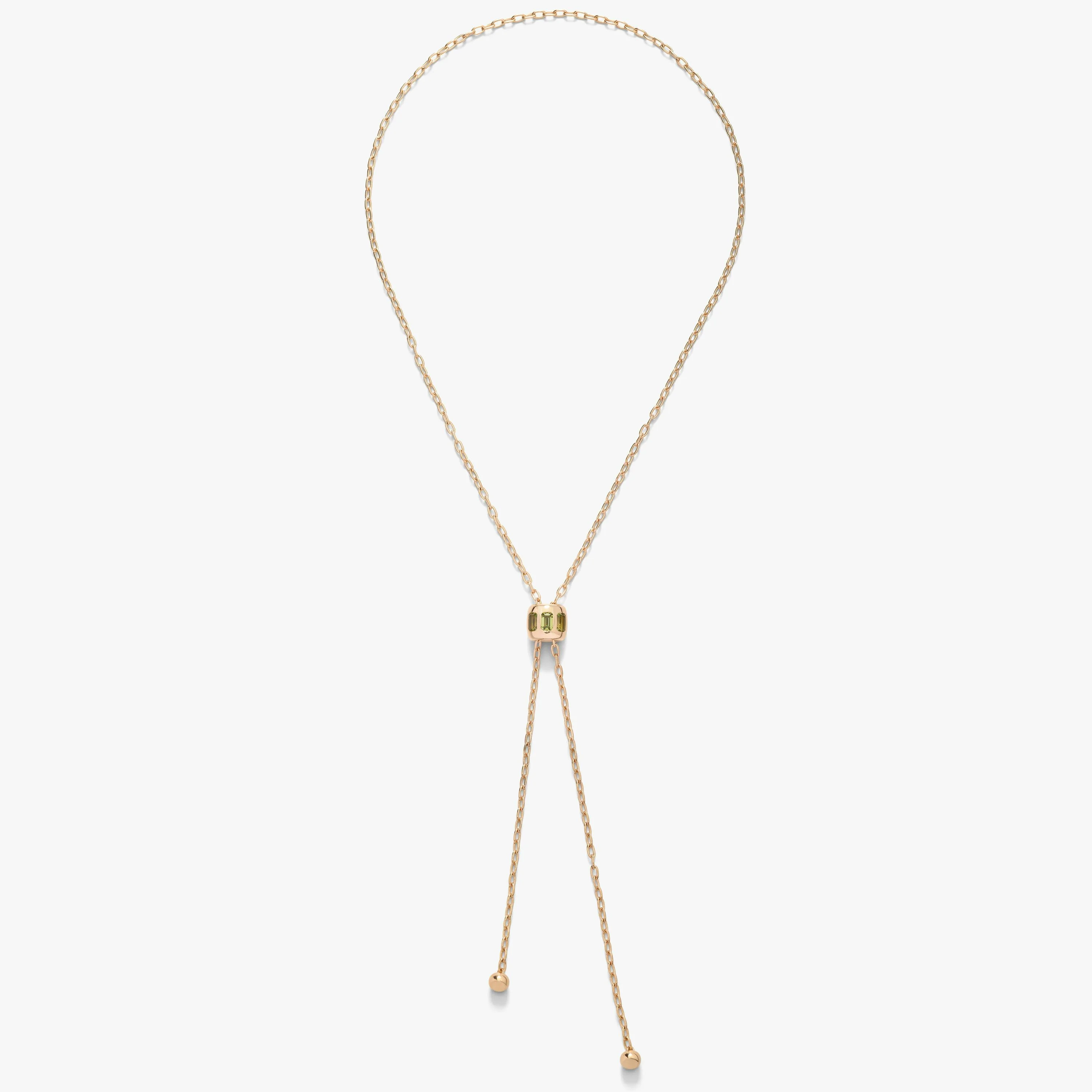 SKU: PCC3020_O7000_000EY Length: 75 cm Necklace In 18K Rose Gold With 3 Peridots (≈1.7 Cts). Color blazes in Iconica’s distinctive designs that honor Milan’s rich heritage of jewellery making. Reminiscent of Pomellato’s early Bisanzio collections, the sculptural silhouette of Iconica meets with the opulence of the Byzantine era in a strikingly modern interpretation of a classic jewellery style. Flawlessly smooth gold is combined with the vivid color of gemstones, only possible thanks to Pomellato’s mastery in both design and craftsmanship. The open chain of our lariat-style necklace is held together with an adjustable gold slider covered in colorful gems. This innovative sliding system has a versatile all-gold mechanism that glides over the delicate chain allowing different ways to wear the necklace.