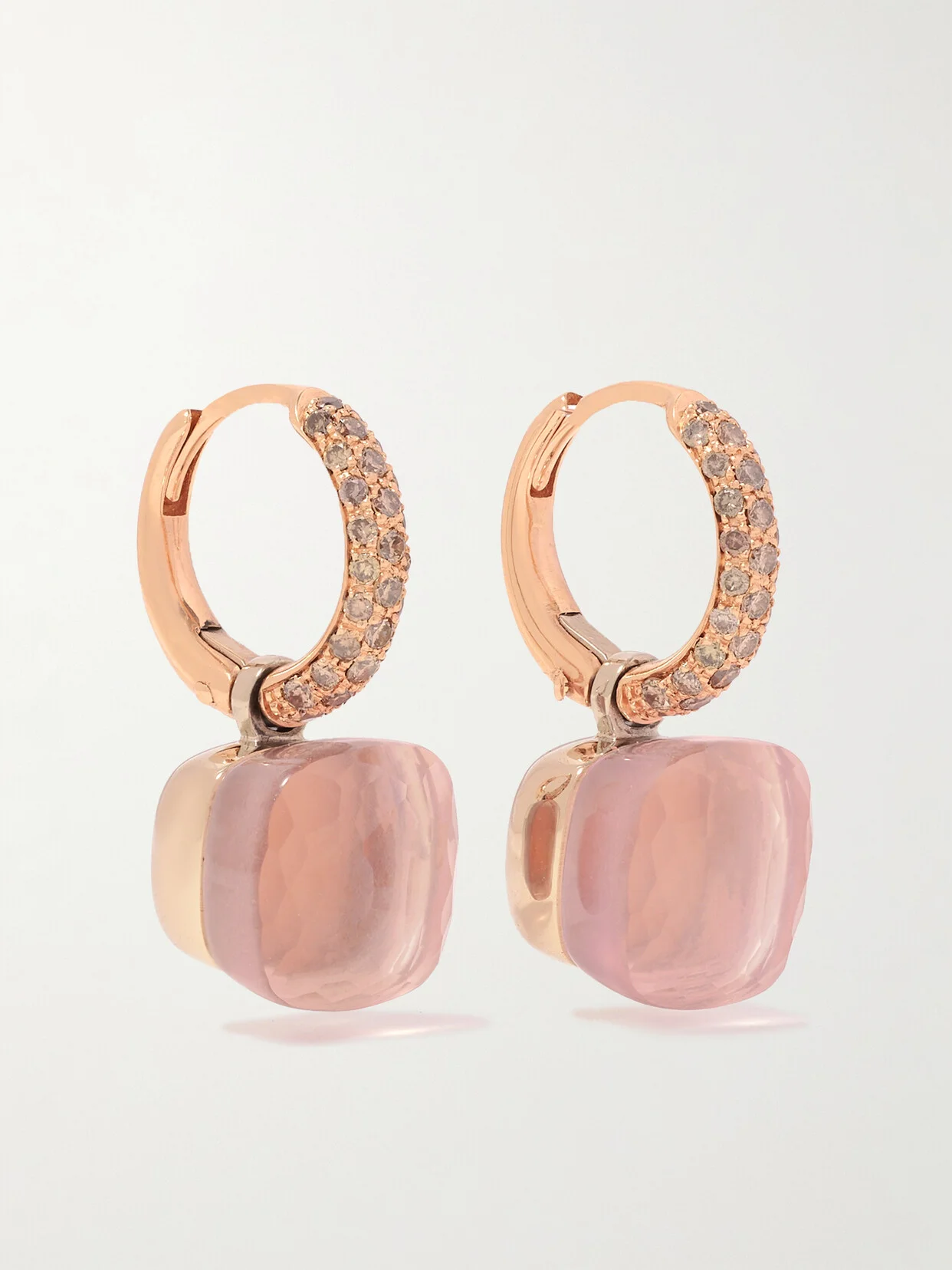 Milanese flair underscores Pomellato's romantic fine jewelry. Crafted by the diligent and steady hands of in-house artisans, these 'Nudo' earrings are cast from 18-karat rose and white gold and encrusted with light-catching diamonds. They suspend chunky chalcedony and rose quartz drops, intended to reflect the duality of feminine energy.