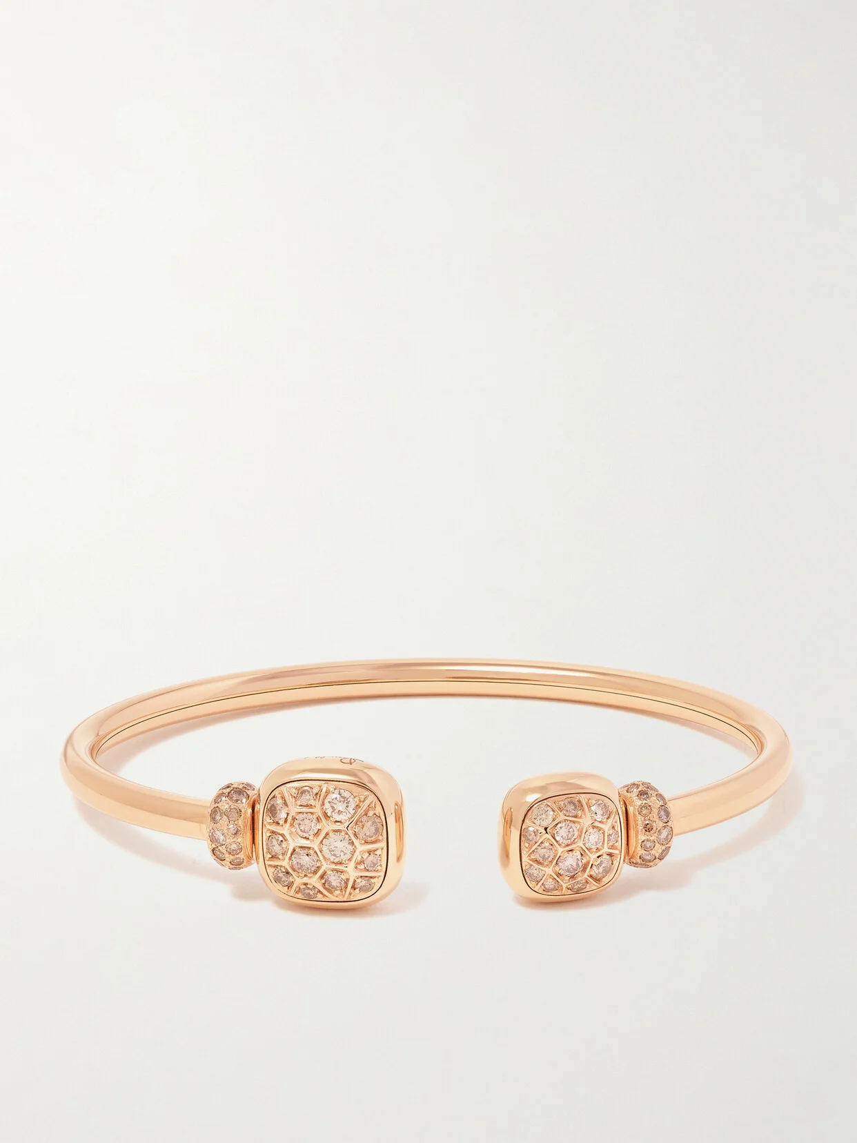 Pomellato's 'Nudo' cuff is set with brown diamonds, which emit a warm and beautiful glow. It's handcrafted from 18-karat rose gold that complements their unique tone and is detailed with glimmers of white topaz.