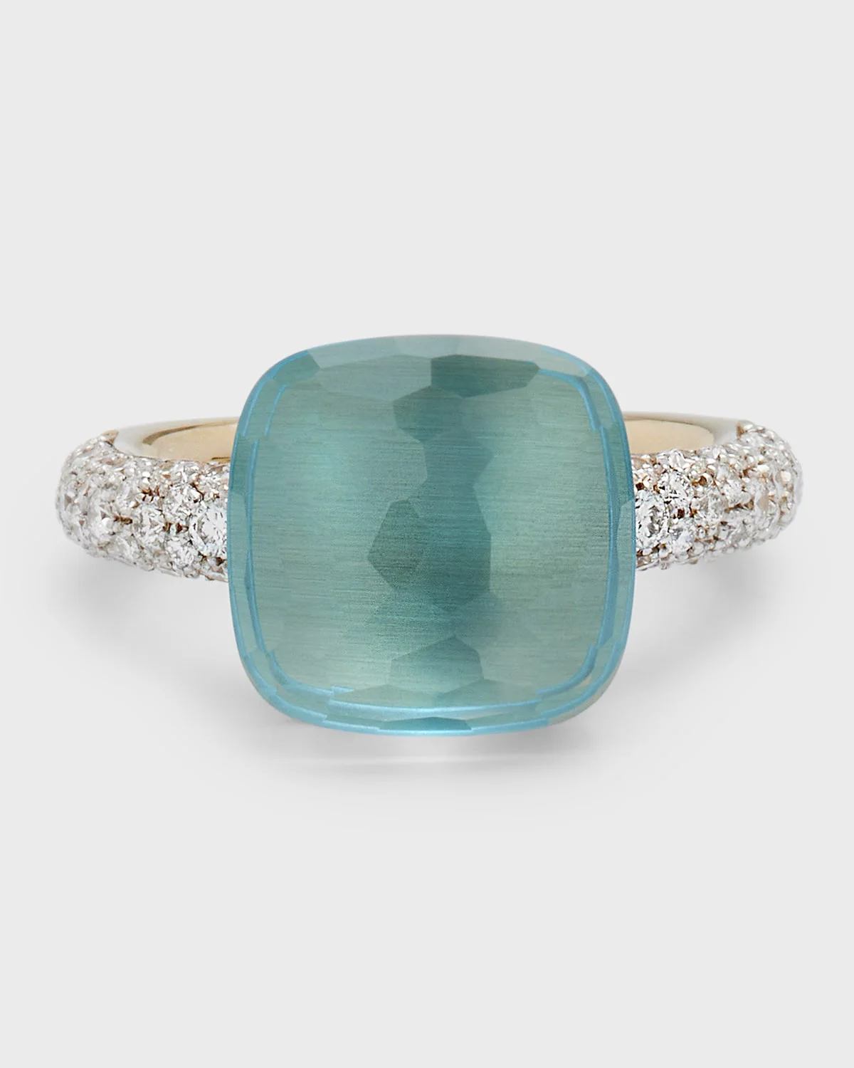 - A precious version of the brand's most iconic ring, this Nudo features a diamond-dusted ring band. Characterized by a 'nude' stone with a copyrighted design, the audacity and color choices of Nudo make it a striking original. - Pomellato ring from the Nudo collection - Approx. ring size 56 - 18-karat white and rose gold - Cushion-cut London blue topaz - Sides decorated with white diamonds - 0.73 total diamond carat weight - Made in Italy - Please note: - Rings are available in European sizes. For additional sizes, not listed online, please contact a Neiman Marcus store or sales representative directly.