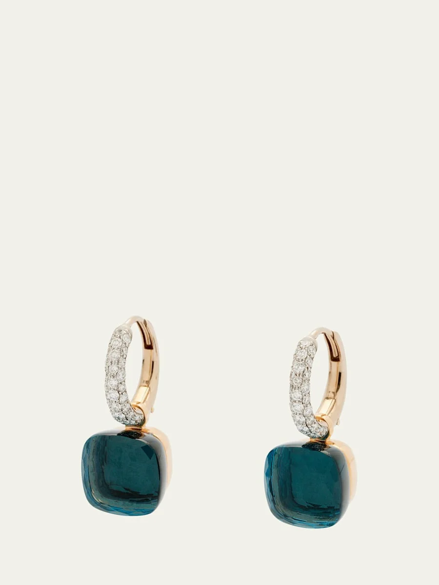 Pomellato earrings from the Nudo Collection. 18-karat white gold and rose gold. Faceted London blue topaz drops. Pave diamond huggie hoops. 0.55 total diamond carat weight. Lever backs for pierced ears. Approx. 0.75"L. Made in Italy. Online Inquiries: BGS21_PFY07| Store Inquiries: #2552394