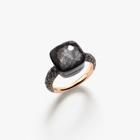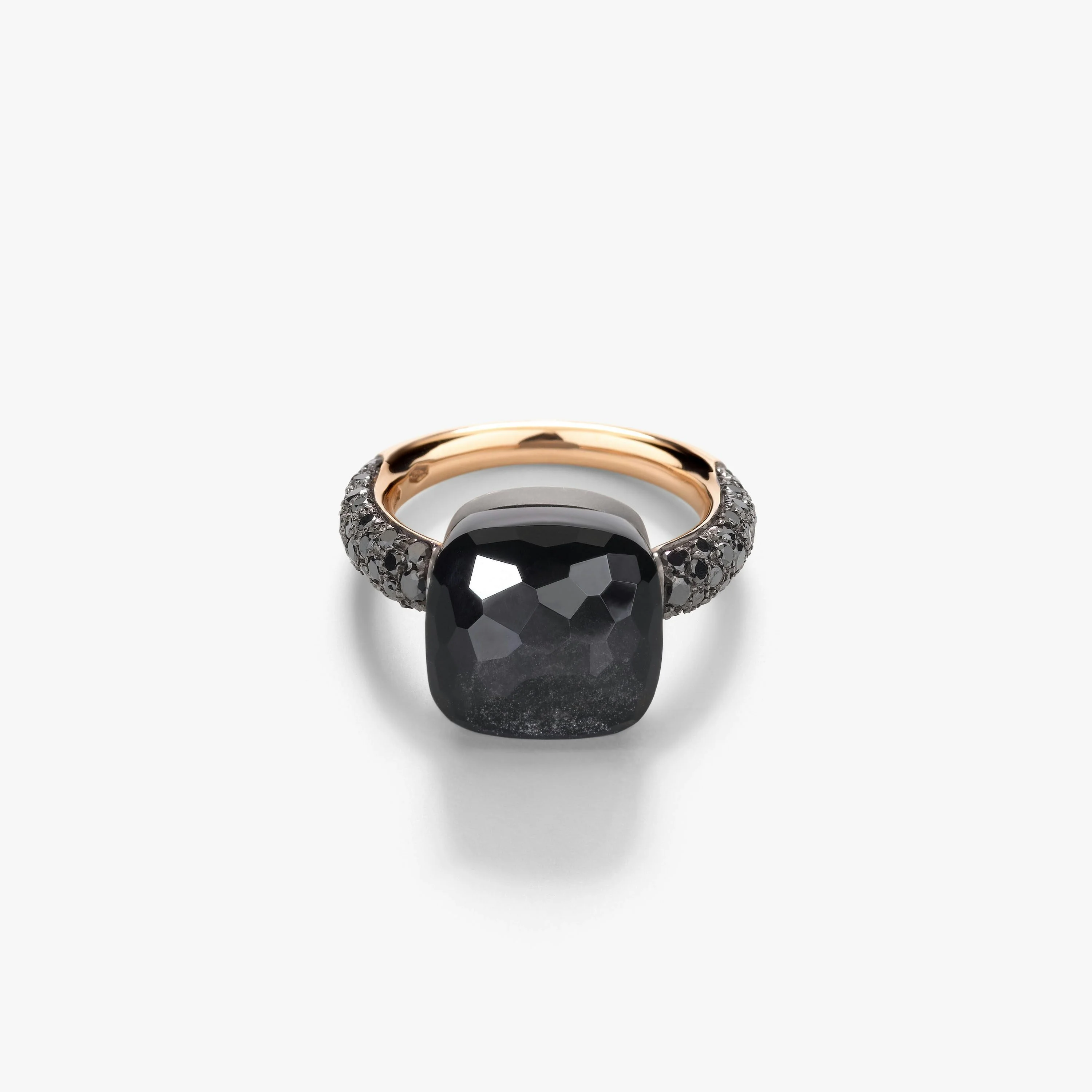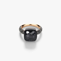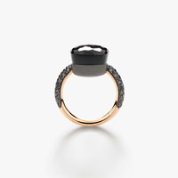 SKU: PAB4011_OT000_DBKOS Ring In 18K Rose Gold And Titanium With 1 Obsidian (≈10 Cts) And 58 Black Treated Diamonds (≈0.8 Ct) On 18K Black Rhodium-Plated Rose Gold. The Nudo ring in Obsidian winks with opaque mystery in petit, classic or maxi-size. Obsidian’s nocturnal beauty rests atop a rose-gold shank and titanium cullet, surrounded by black diamonds on its band.
