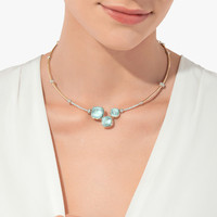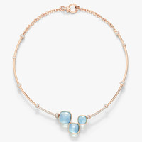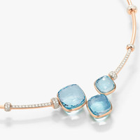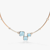 SKU: PCC2040_O7WHR_DB0OY Necklace In 18K Rose Gold With 3 Sky Blue Topazes (≈40.5 Cts) And 219 White Diamonds (≈1.9 Cts) On 18K White Rhodium-Plated Rose Gold. A chic necklace unites the boldness of Nudo with the colour intensity and volumes of the Clessidra cut. Three double-faced sky blued topaz gemstones are set on a semi-rigid short necklace with diamonds.