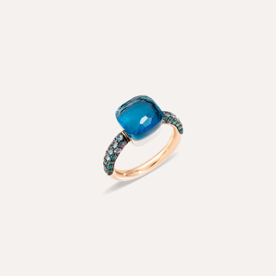 SKU: PAB9040_O6000_TTBTL Ring In 18K Rose And White Gold With 1 London Blue Topaz, 1 Turquoise (≈10 Cts) And 38 Diffused Topazes (0.9 Ct) On 18K Black Rhodium-Plated Rose Gold. Pomellato dives into Mediterranean inspiration with the intense blues of Nudo gemstones.