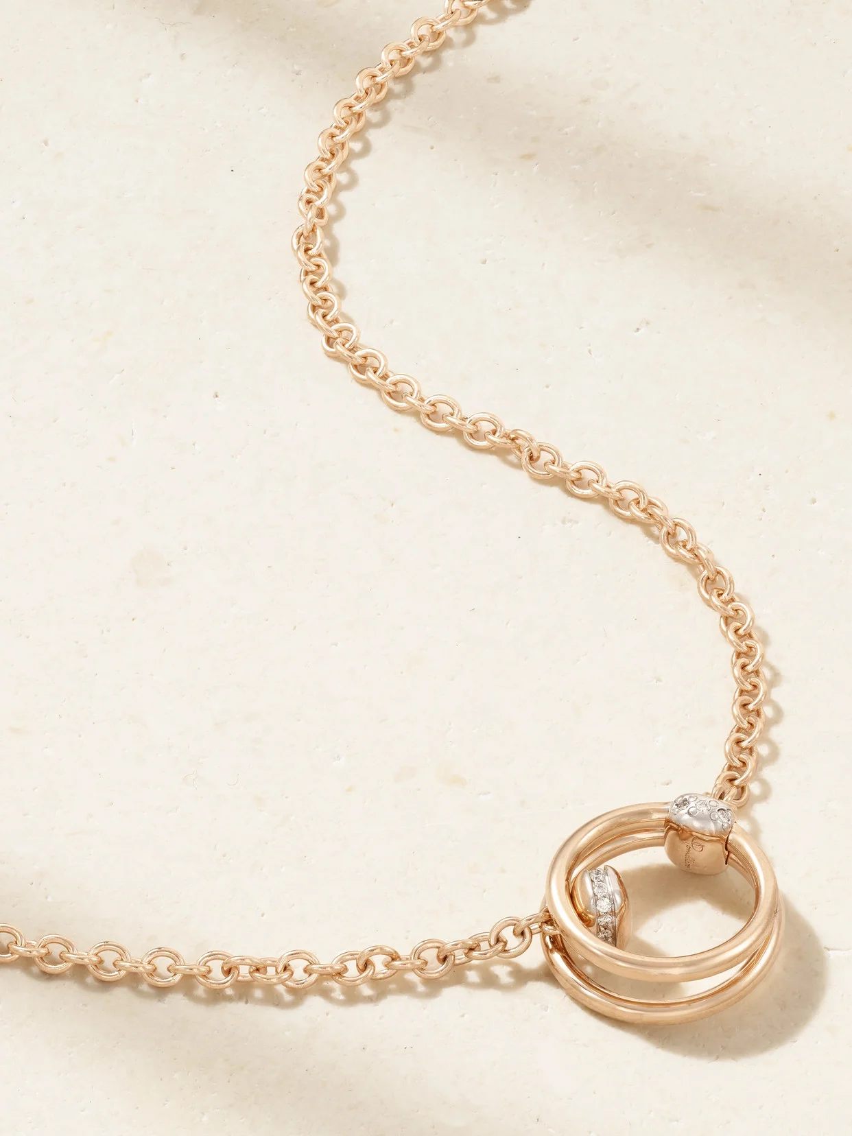 Pomellato's necklace is part of the label's 'Together' collection that's inspired by - and celebrates - love in all its forms. Handmade from 18-karat rose gold, it has a circular pendant threaded with two diamond-encrusted rhodium-plated links - one sits between the rings, allowing it to move freely.