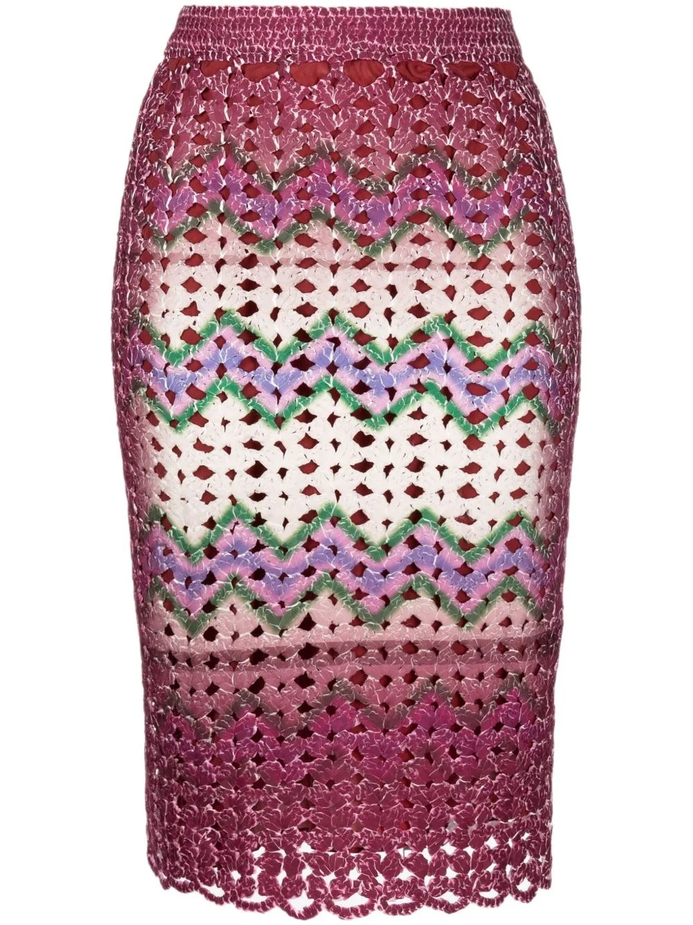 graphic-print crochet-knit midi skirt Highlights - Multicolour - Crochet knit - All-over graphic print - Rear zip fastening - Elasticated waistband - Mid-length - Scallop hem Imported Composition Cupro 58%, Viscose 42% SIZE & FIT Model measurements Height 5 ft 10 in(1.77 m) Bust/Chest 31.49 in(80 cm) Hips 35.43 in(90 cm) Waist 25.19 in(64 cm) FittingInformation This mini-length skirt is intended to be worn low on the hips The internal briefs provide a close and supportive fit Made from a midweight non-stretch fabric This piece fits small – take one size up