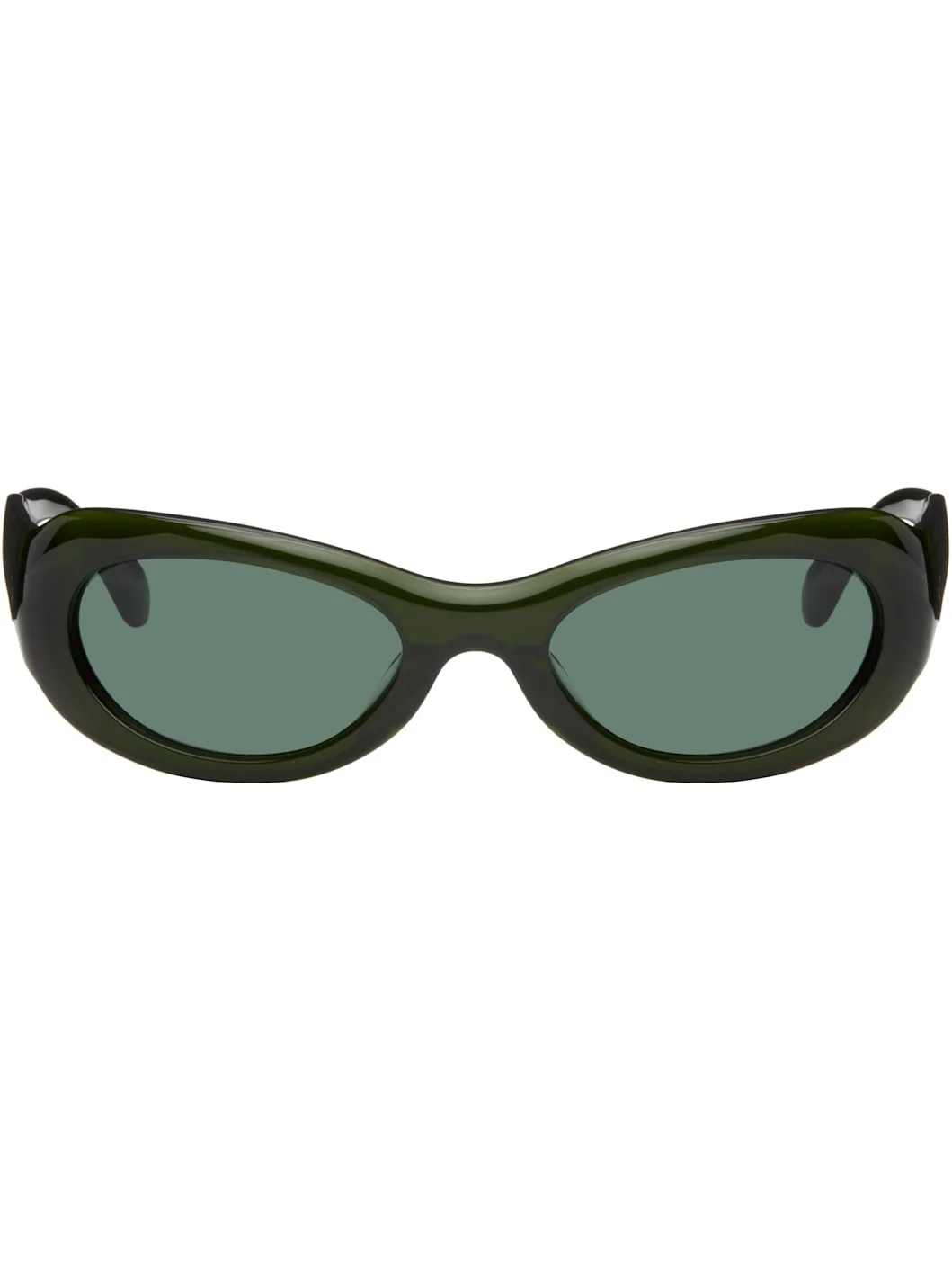 Handcrafted oval cat-eye semi-transparent acetate-frame sunglasses in green. · Green lenses · 100% UVA/UVB protection · Integrated nose pads · Rivets at temples · Exposed core wires · Includes pouch · Size: 53.21 135 Part of the exclusive SSENSE HEAT capsule. Supplier color: Green/Green Acetate. Made in Japan 252458F005001