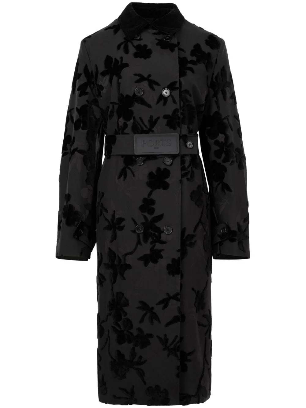 floral-print trench coat Highlights - Black - Floral print - Double-breasted button fastening - Long sleeves - Belted waist - Embossed logo to the front Imported Composition Viscose 100%