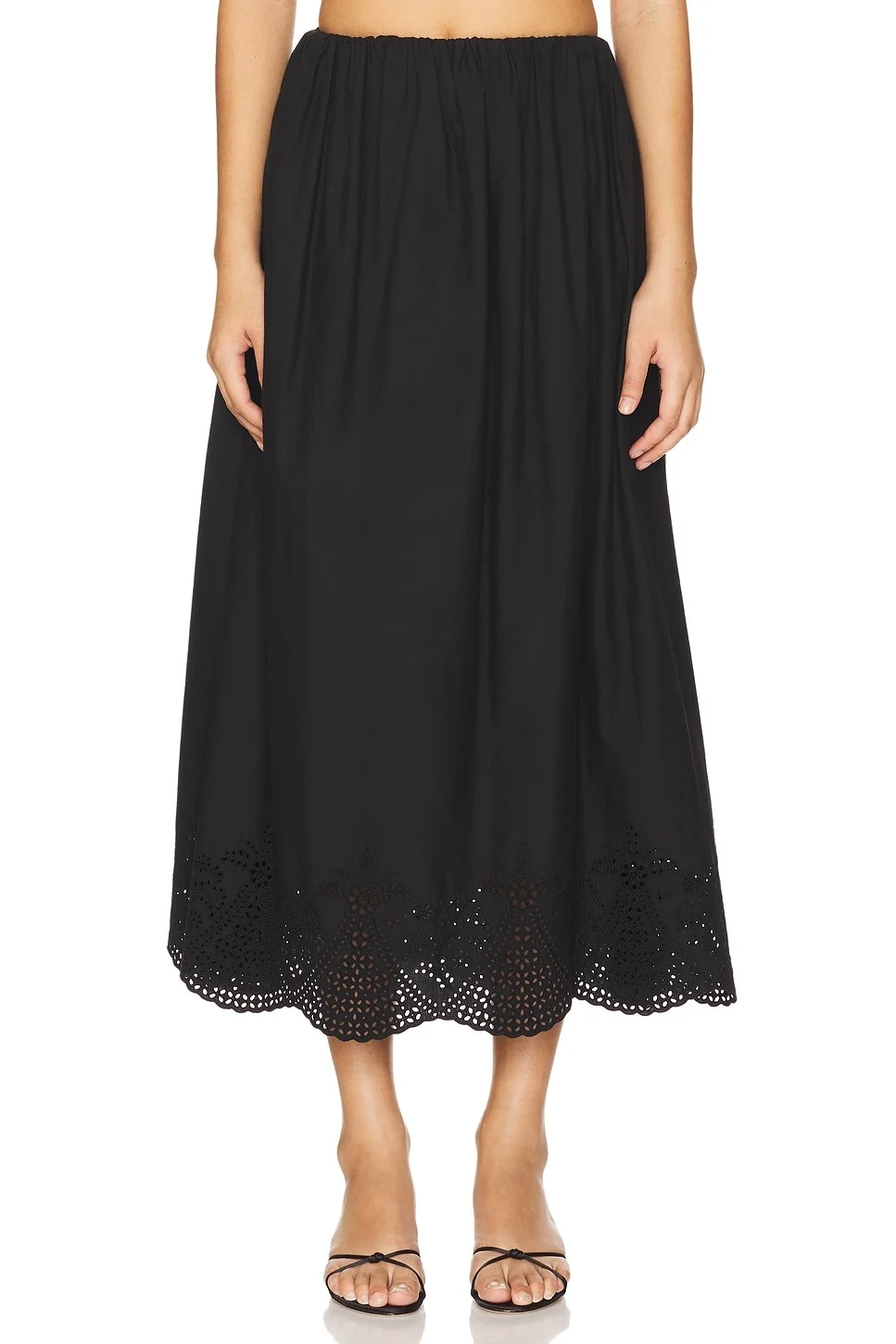 - Poplin textile - Imported - Hand wash recommended - Partially lined - Pull-on styling with elastic waistband - Side slit pockets - Poplin fabric with eyelet detail at hem Item not sold as a set - Skirt measures approx 34" in length - Revolve Style No. PSSE-WQ13 - Manufacturer Style No. PS1236-BLK