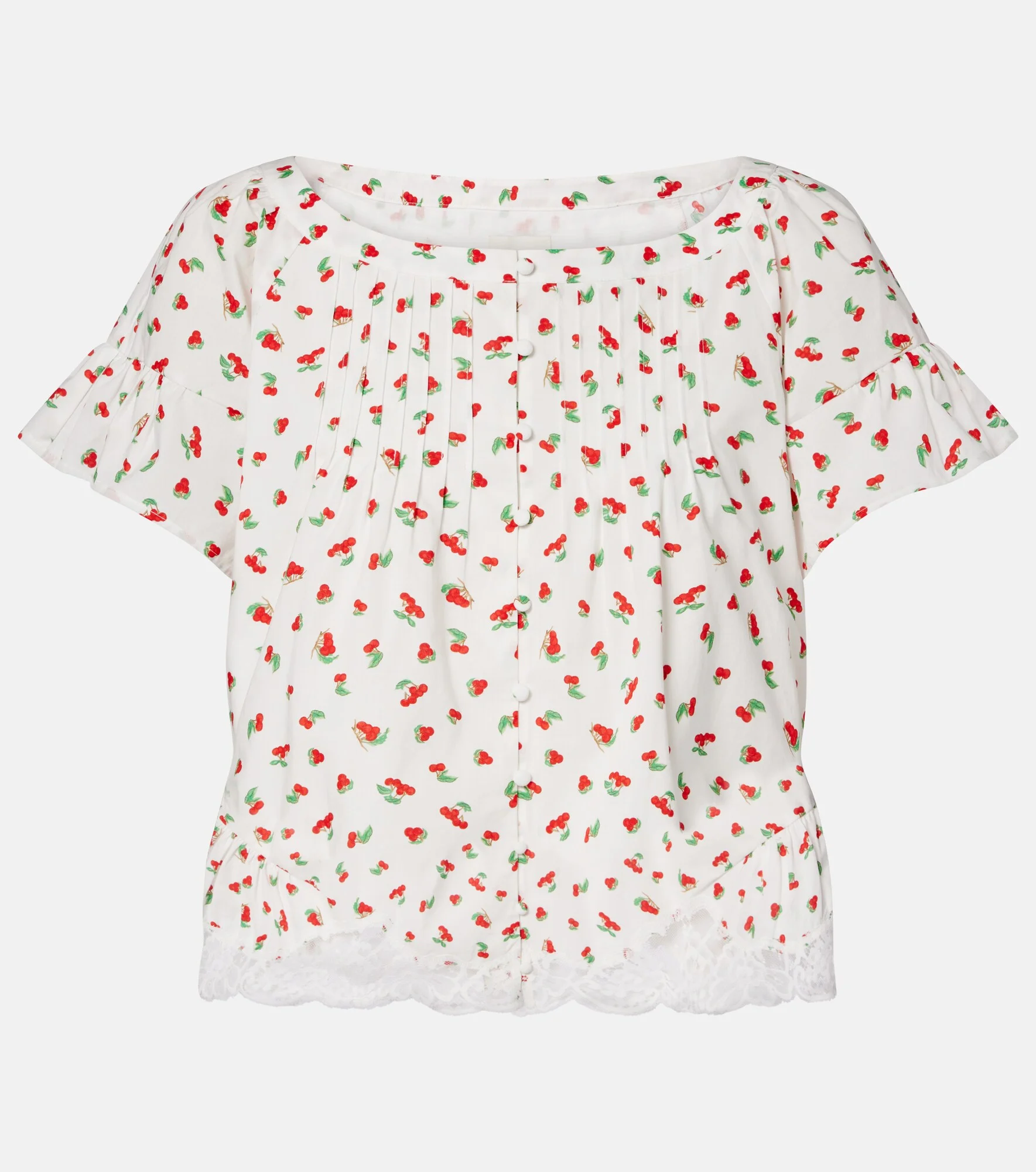 Posse channels effortless elegance through timeless silhouettes and refined simplicity. The Delia cotton blouse is a short-sleeved style with delicate lace trims and printed cherries throughout. Product Details - Material: 100% cotton - Care instructions: dry clean - Made in China - Color: white - Designer color name: Cherry print - Closure: buttoned front - Item number: P01169032 Size & Fit - True to size - Designed for a loose fit - Non-stretchy fabric - Falls to the hip - The model seen in the picture is 178cm-5'10" and wearing a size XS