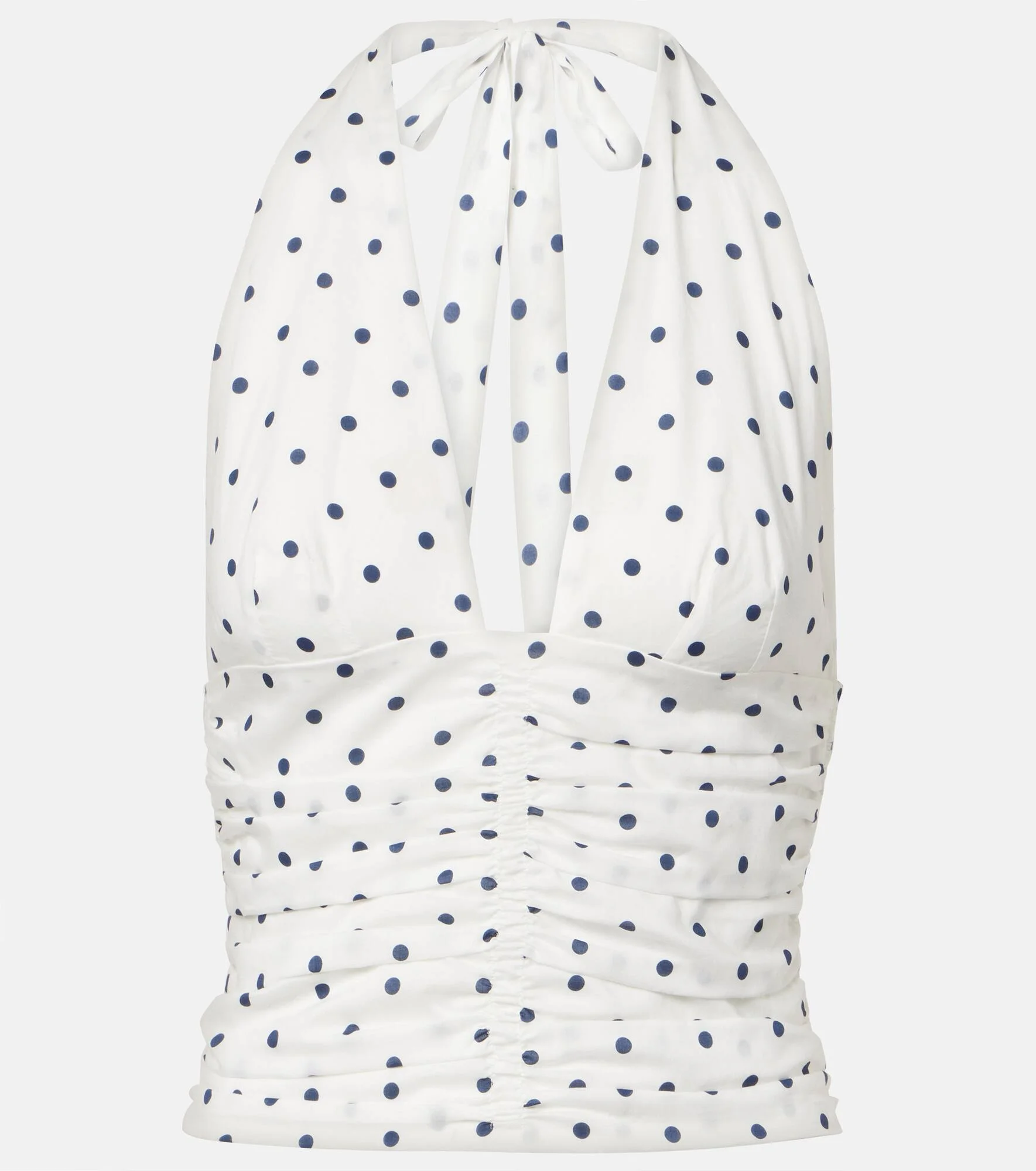 Posse is an ode to effortless elegance and meticulous attention to detail, creating timeless, irreplaceable pieces. The Edie halterneck top features delicate gathers at the elasticated bodice and a plunging V-neckline. Product Details - Material: 60% Tencel®, 40% cotton - Care instructions: dry clean - Made in China - Color: white - Designer color name: Cream/Blue Polka Dot - Item color: white, blue - Collar: V-neck - Closure: zipped side - Self-tie neck - Item number: P01128109 Size & Fit - True to size - Low back - Elasticated top - Cinched waist - Non-stretchy fabric - Cropped - The model seen in the picture is 178cm-5'10" and wearing a size XS