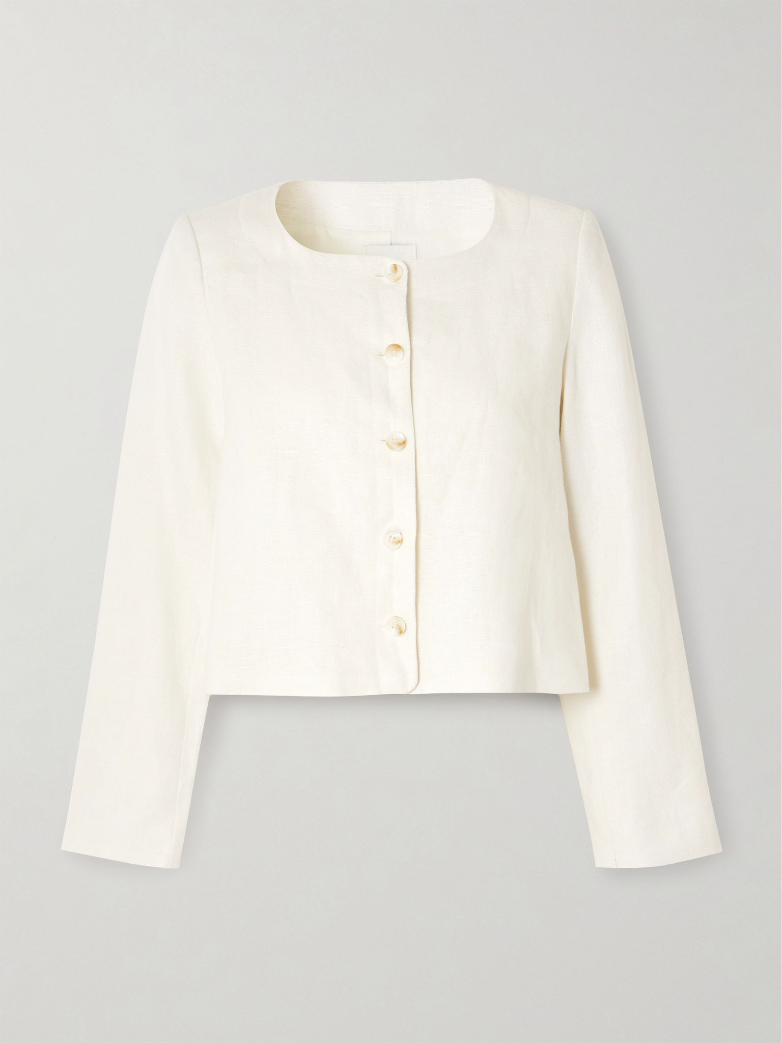 Posse's collections are designed to celebrate the "timeless over the temporary". Tailored from certified linen, this 'Emma' jacket has a boxy, cropped shape with a round neckline and tonal buttons. We have the matching 'Noelle' pants in our edit, too. Lower-Impact Materials. This product is made using at least 50% lower-impact materials or ingredients. Find out more about our NET SUSTAIN criteria here. Size & Fit - Fits true to size, take your normal size - Designed for a boxy fit - Cropped length - Mid-weight, non-stretchy fabric - Model is 175cm/ 5'9" and is wearing a size Small Model measurements: - Bust: 81cm/ 32” - Waist: 61cm/ 24” - Hip: 87cm/ 34” Details & Care - Cream linen - Button fastenings through front - 100% linen - Fully lined