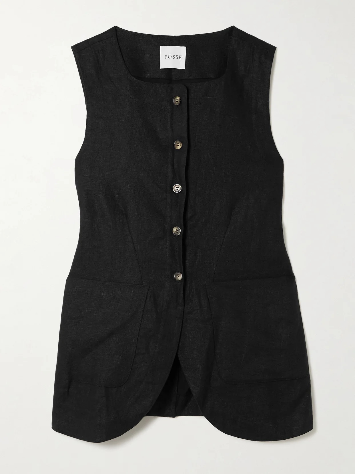 POSSE's collections are filled with the dependable building blocks you need to create a well-rounded personal uniform. This 'Emma' vest is cut from airy linen for a slim fit that kicks out to a flared hem and has a chic square neckline. Shop our edit of skirts and shorts to find the perfect match. Lower-Impact Materials. This product is made using at least 50% lower-impact materials or ingredients. Find out more about our NET SUSTAIN criteria here.