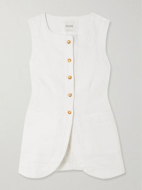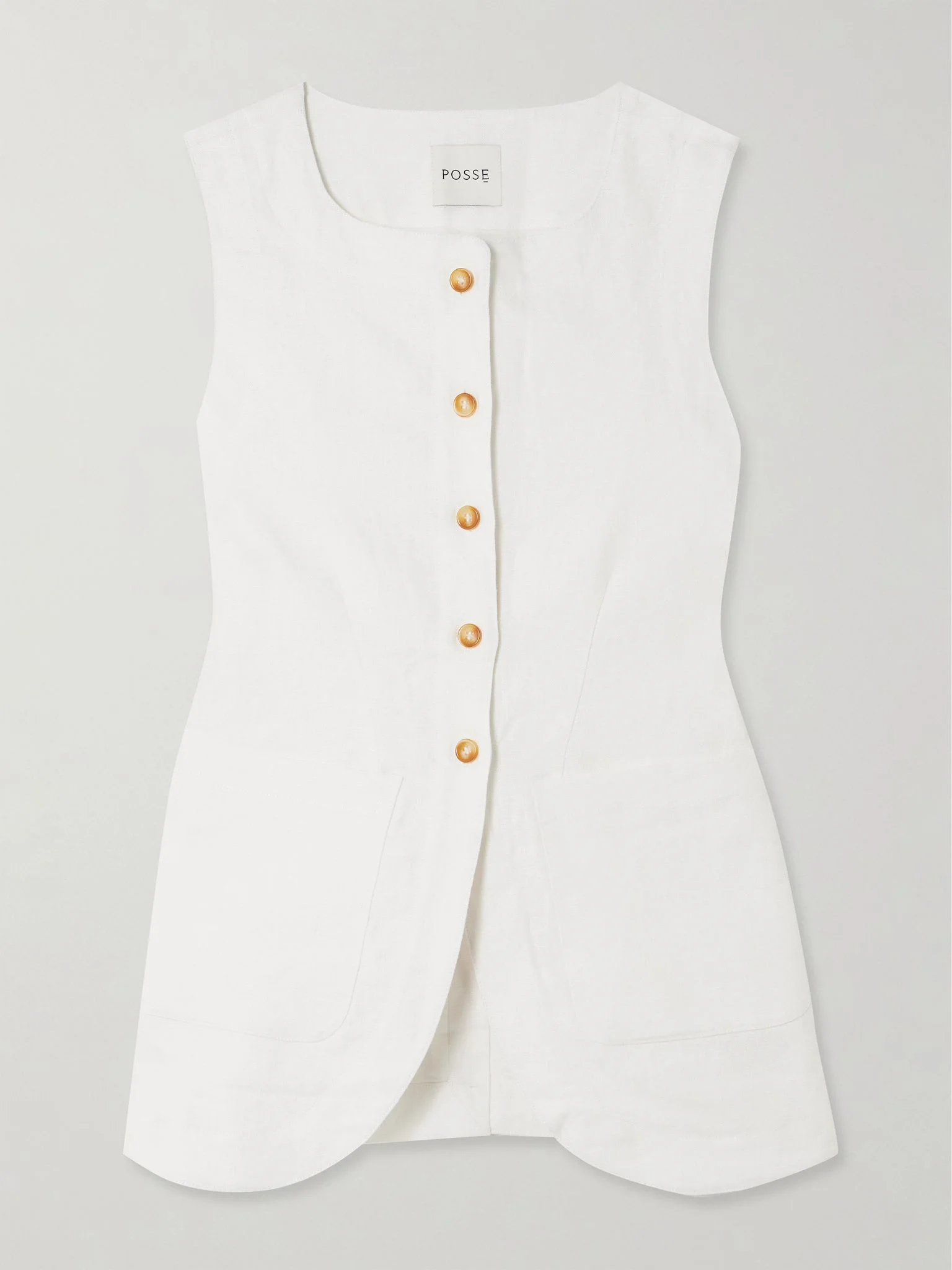 POSSE's collections are filled with the dependable building blocks you need to create a well-rounded personal uniform. This 'Emma' vest is cut from airy linen in a slim fit that kicks out to a flared hem and has a chic square neckline. Shop our edit of skirts and shorts to find the perfect match. Lower-Impact Materials. This product is made using at least 50% lower-impact materials or ingredients. Find out more about our NET SUSTAIN criteria here. Size & Fit - Fits true to size, take your normal size - Designed for a slim fit - Mid-weight, non-stretchy fabric - Model is 180cm/ 5'11" and is wearing a size XSmall Model measurements: - Bust: 76cm/ 30" - Waist: 64cm/ 25" - Hip: 86cm/ 34" Details & Care - Ivory linen - Button fastenings through front - 100% linen - Dry clean