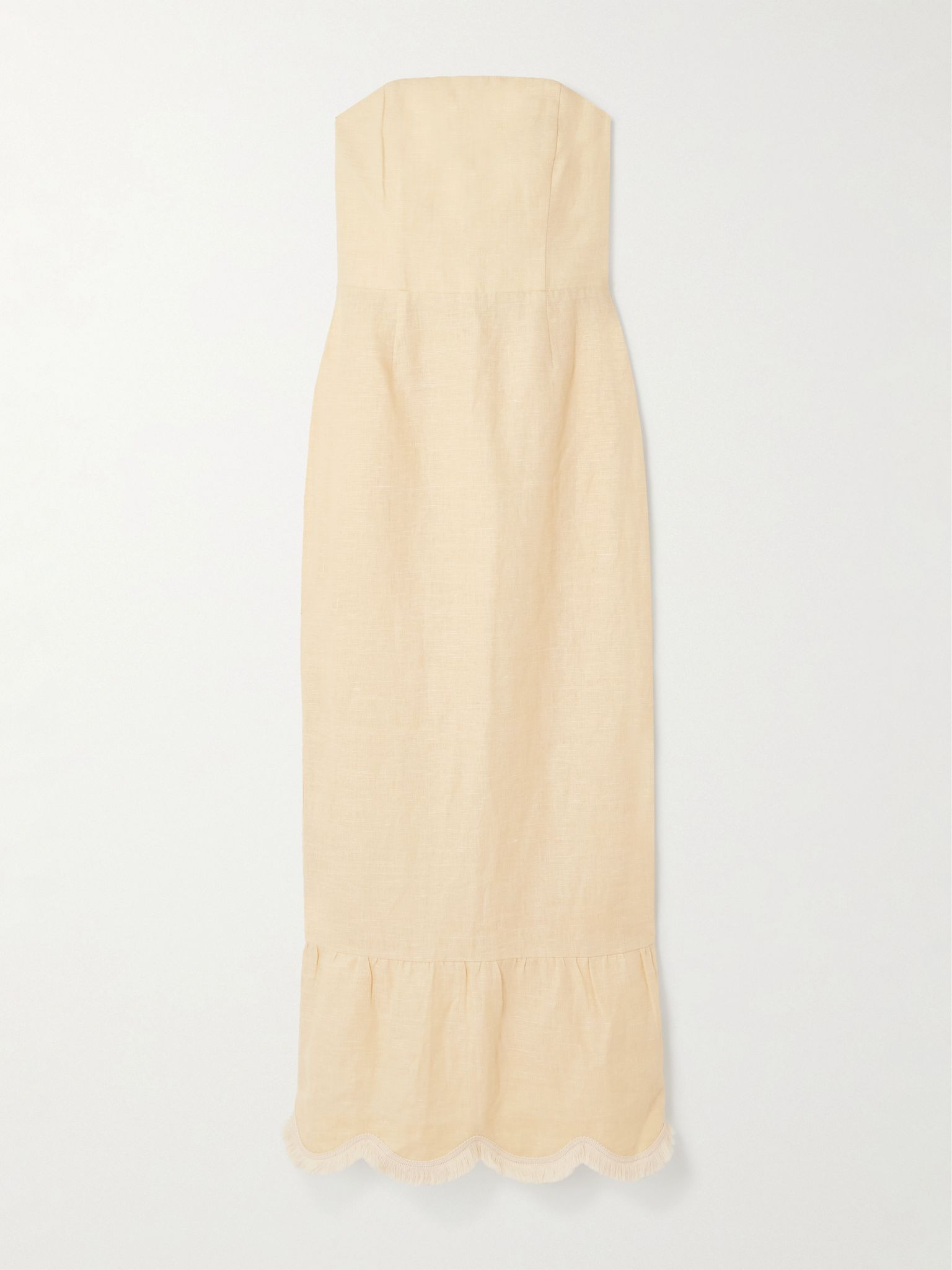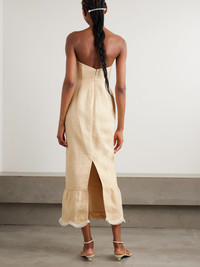Posse's timeless pieces are designed for "those seeking beauty beyond the momentary". Made from certified linen, this 'Essie' dress is cut for a figure-hugging fit and has internal gumming to keep the strapless neckline in place. The swishy fringing along the hem makes every step look glamorous. Lower-Impact Materials. This product is made using at least 50% lower-impact materials or ingredients. Find out more about our NET SUSTAIN criteria here. Size & Fit - Fits true to size, take your normal size - Designed for a close fit - Mid-weight, non-stretchy fabric - Model is 180cm/ 5'11" and is wearing a size Small Model measurements: - Bust: 80cm/ 31.5" - Waist: 65cm/ 25.5" - Hip: 89cm/ 35" Details & Care - Pastel-yellow linen - Concealed hook and zip fastening at back - Partially lined - 100% linen; trim: 100% cotton - Designer color: Dusty Citron