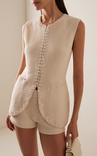 Centered on the principles of slow fashion, Aussie label POSSE is committed to producing the finest fabrications in limited quantities. Each piece is designed to be loved and worn for years to come — to be borrowed, swapped, passed down and cherished across a lifetime. The 'Harlan' knit vest features delicate crochet detailing. Wear it with the matching jacket and shorts. PRODUCT DETAILS - Resort '25 - Button fastening - Composition: viscose, polyester - Designer color: Cream - Dry clean - Imported SIZE & FIT - Designed for a slim fit
