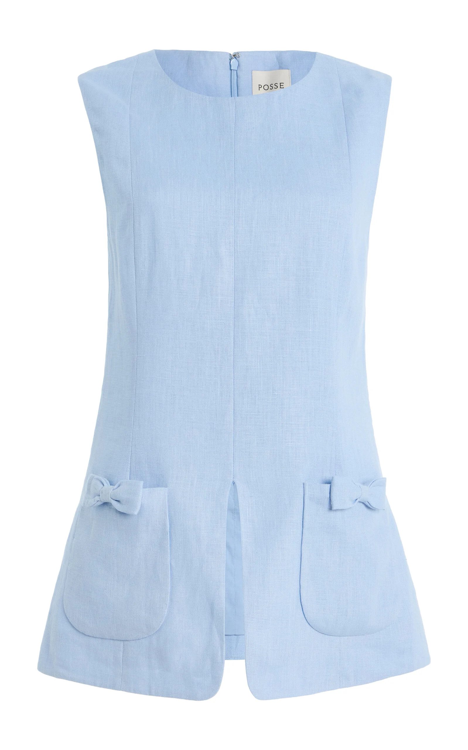 Centered on the principles of slow fashion, Aussie label POSSE is committed to producing the finest fabrications in limited quantities. Each piece is designed to be loved and worn for years to come — to be borrowed, swapped, passed down and cherished across a lifetime. The 'Harper' top has a fitted design made from linen with bow-trimmed pockets and a split hem. Pair with the matching capri pant. PRODUCT DETAILS - Resort '26 - Button fastening - Composition: 100% linen - Dry clean - Imported SIZE & FIT - Our model is wearing a size Small - Model is 5'9" with a 32" bust, 24" waist, and 34.5" hip