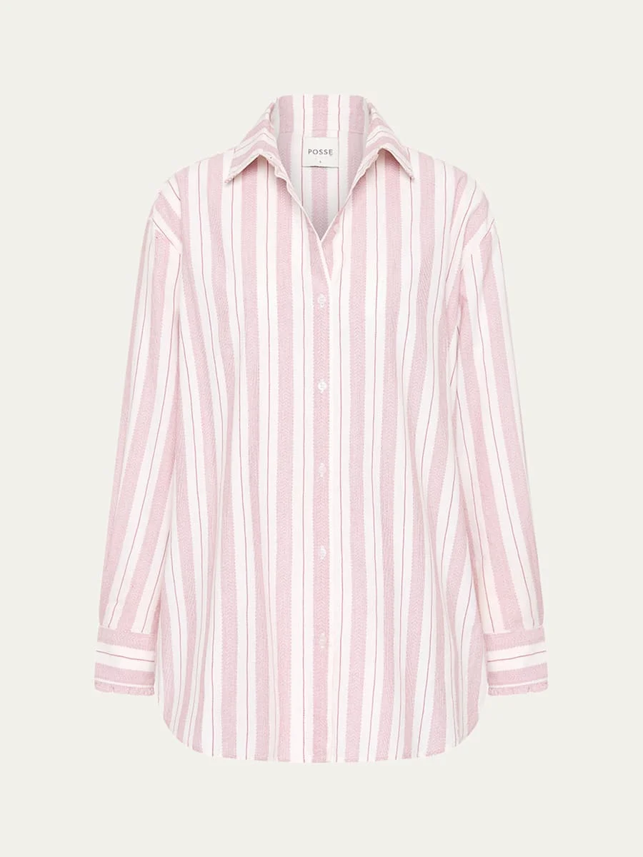 Posse "Lena" shirt crafted from a breathable cotton handloom in an exclusive vintage-inspired stripe Approx. 31.1"L from shoulder to hem Spread collar Long sleeves with decorative frills at the cuff; approx. 22.4"L Yoked back Hip length Oversized fit Button front closure Cotton Imported Online Inquiries: BGS21_T6E04| Store Inquiries: #4967573