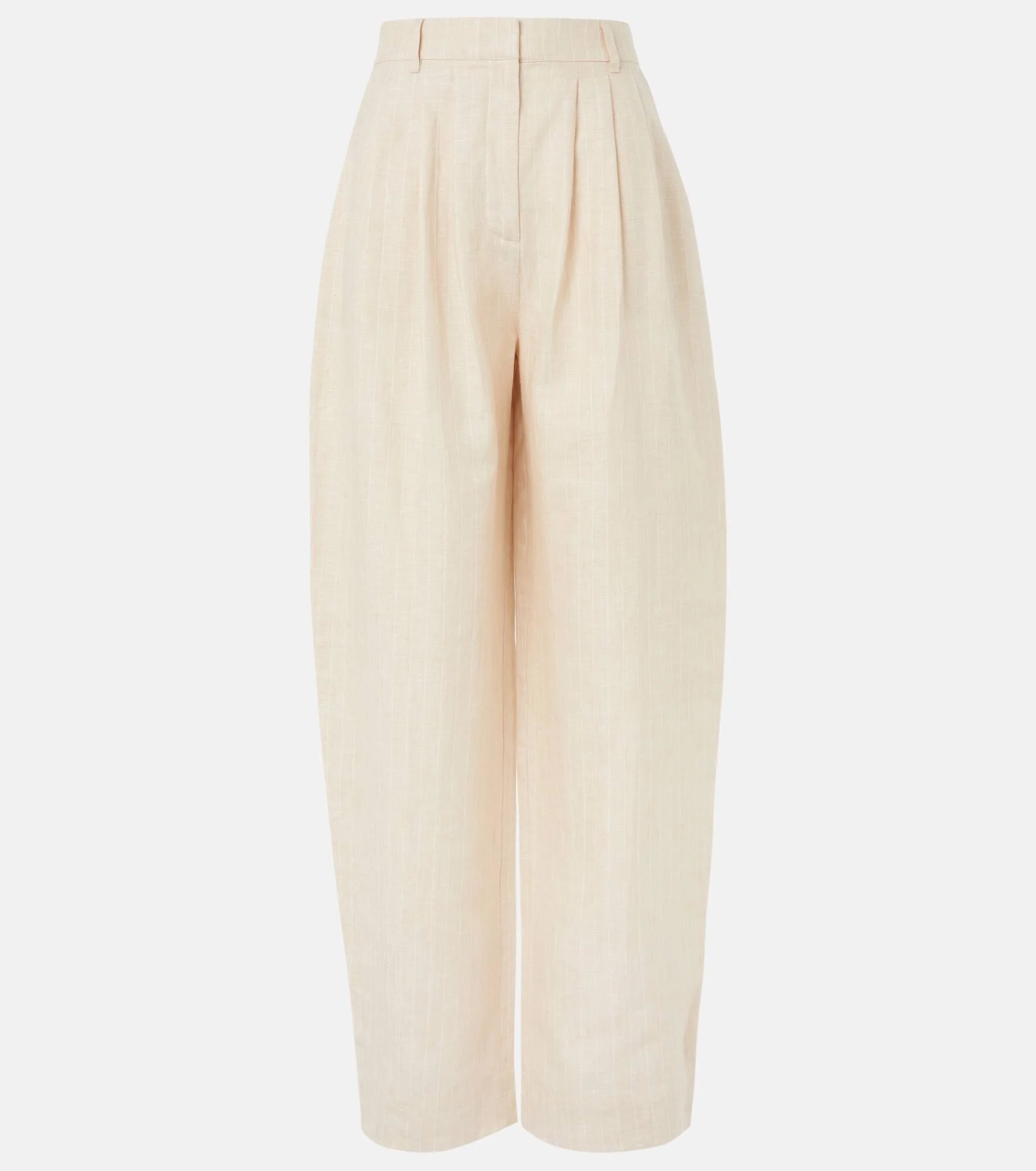 Product Details - Material: 100% linen - Care instructions: dry clean - Made in China - Designer color name: Beige Pinstripe - Pocket lining: 100% cotton - Other inner trims: 100% cotton - Closure: zip, hook, and button fastening - Pockets: side slit pockets - Belt loops - Item number: P01040924 Size & Fit - True to size - Non-stretchy fabric - Tapered leg - High-waisted - The model seen in the picture is 178cm-5'10" and wearing a size XS