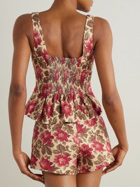 Cut in a fit-and-flare shape, POSSE's 'Rosalie' top is pintucked before falling to a peplum hem. It's made from breathable linen patterned with a floral print and has a flexible shirred back. Keep your styling simple with faded denim and ballet flats. Lower-Impact Materials. This product is made using at least 50% lower-impact materials or ingredients. Find out more about our NET SUSTAIN criteria here. Size & Fit - Fits true to size, take your normal size - Designed for a slim fit - Mid-weight, non-stretchy fabric - Model is 180cm/ 5'11" and is wearing a size Small Model measurements: - Bust: 76cm/ 30" - Waist: 64cm/ 25" - Hip: 86cm/ 34" Details & Care - Ivory, tonal-red and green linen - Concealed hook and zip fastening at side - 100% linen - Dry clean - Designer color: Rose Bud