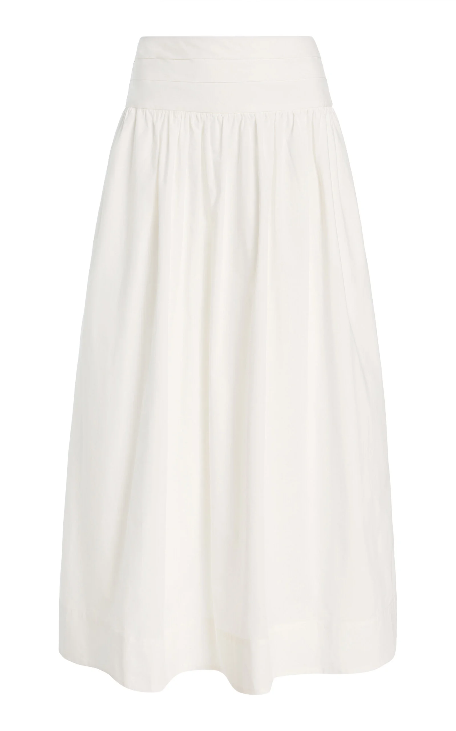 Centered on the principles of slow fashion, Aussie label POSSE is committed to producing the finest fabrications in limited quantities. Each piece is designed to be loved and worn for years to come — to be borrowed, swapped, passed down and cherished across a lifetime. 'Rue' skirt has a full silhouette made from cotton that gently gathers at the high-cut paneled waist. Pair with the matching top. PRODUCT DETAILS - Resort '26 - Zip fastening - Composition: 100% cotton - Designer color: Cream - Dry clean - Imported SIZE & FIT - Our model is wearing a size Small - Model is 5'9" with a 32" bust, 24" waist, and 34.5" hip