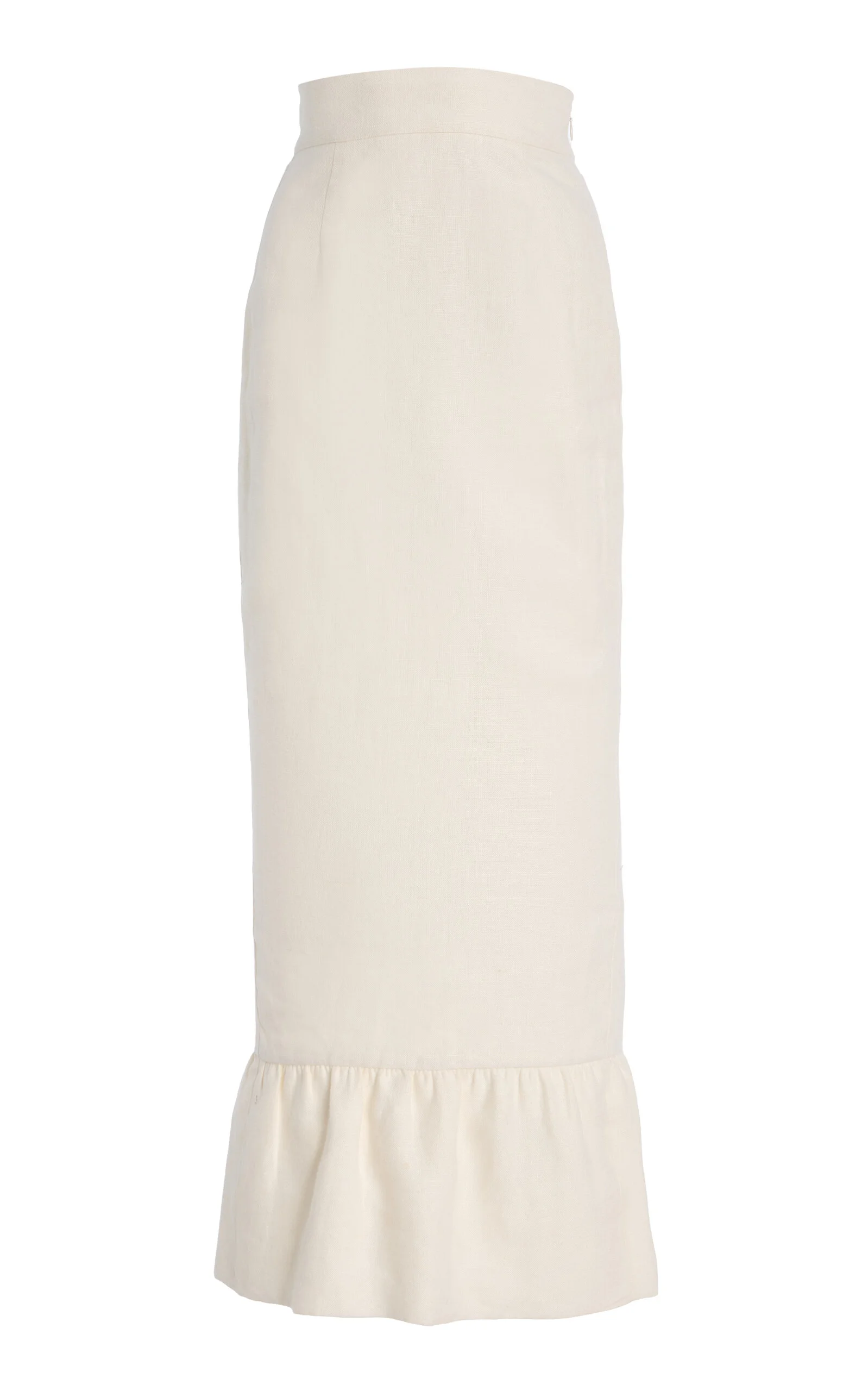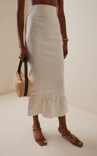 Centered on the principles of slow fashion, Aussie label POSSE is committed to producing the finest fabrications in limited quantities. Each piece is designed to be loved and worn for years to come — to be borrowed, swapped, passed down and cherished across a lifetime. The Matilda Column Skirt is cut from premium linen in a sleek column silhouette that falls effortlessly to a frilled maxi hem. It sits comfortably on the high-rise waist and features a subtle black split to ensure ease of movement. Pair with the matching vest. PRODUCT DETAILS - Pre-Fall '25 - Zip fastening - Composition: 100% linen - Designer color: Cream - Dry clean - Imported SIZE & FIT - Our model is wearing a size Small - Model is 5'10" with a 32" bust, 23.5" waist, and 34.5" hip