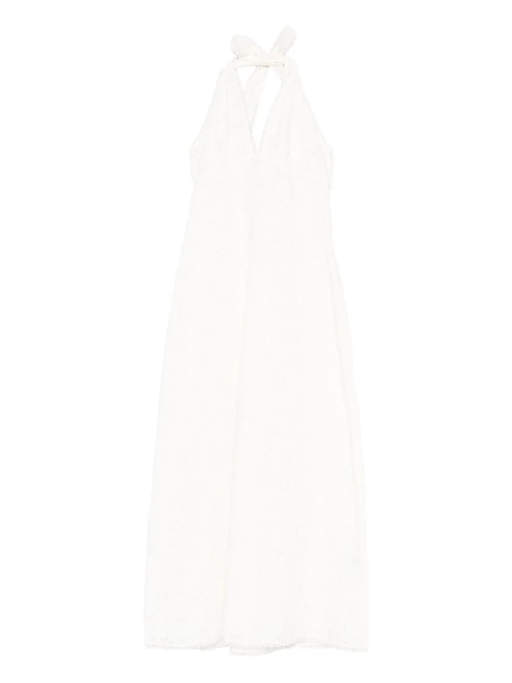 Salma halterneck midi dress Highlights - White - V-neck - Midi length - Halterneck - Tie fastening Imported Composition Outer: Cotton 100%, Polyester 100% Lining: Cotton 100% SIZE & FIT Model measurements Height 5 ft 9 in(1.76 m) Bust/Chest 31.88 in(81 cm) Hips 35.43 in(90 cm) Waist 24.8 in(63 cm) Washing instructions Machine Wash