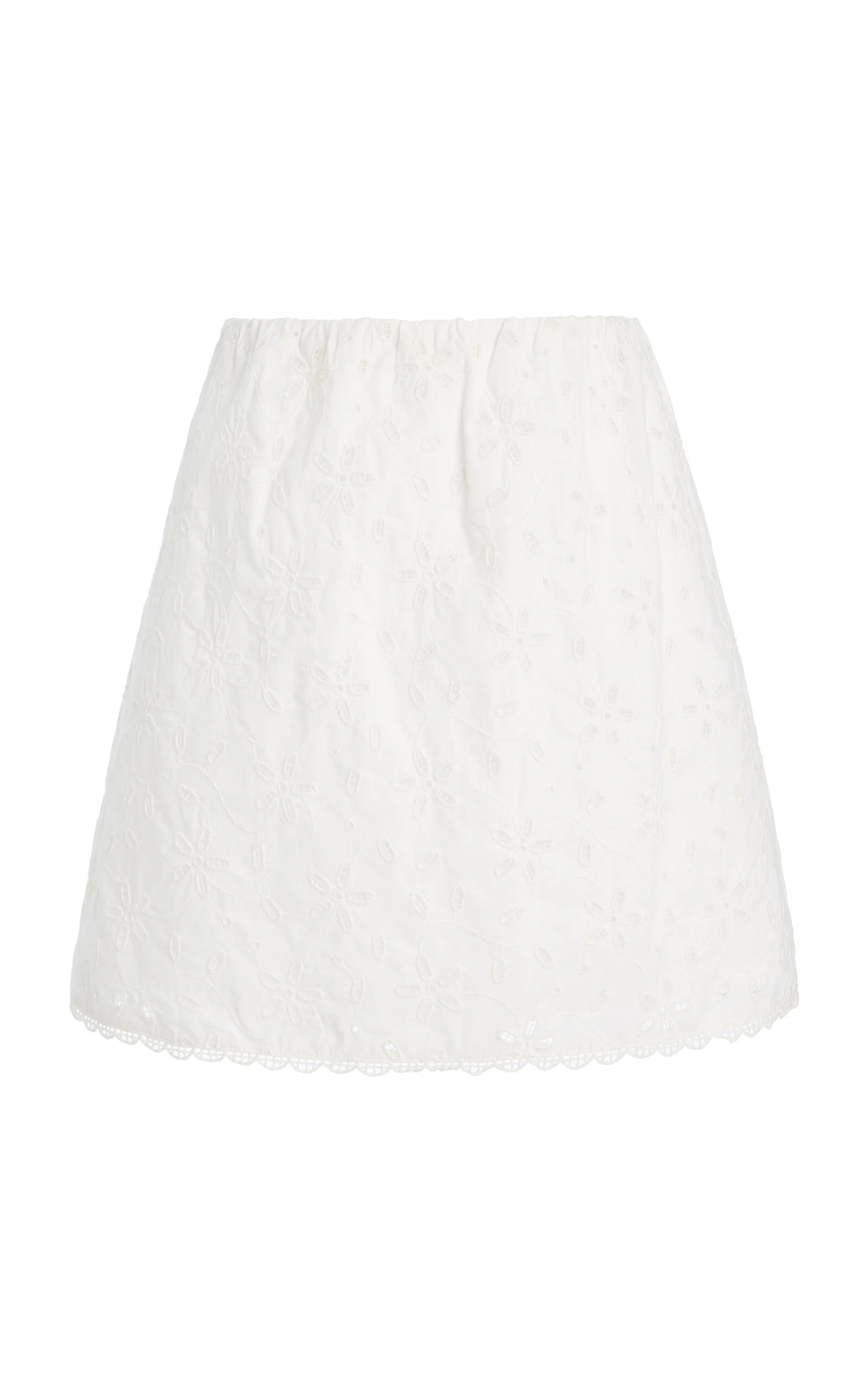 Centered on the principles of slow fashion, Aussie label POSSE is committed to producing the finest fabrications in limited quantities. Each piece is designed to be loved and worn for years to come — to be borrowed, swapped, passed down and cherished across a lifetime. The 'Salma' is a pull-on mini skirt made from eyelet cotton with an elastic waistband. Pair with the matching top. PRODUCT DETAILS - Resort '26 - Pull on - Composition: 100% cotton - Designer color: Vintage White - Dry clean - Imported SIZE & FIT - Our model is wearing a size Small - Model is 5'10" with a 30" bust, 24" waist, and 34" hip