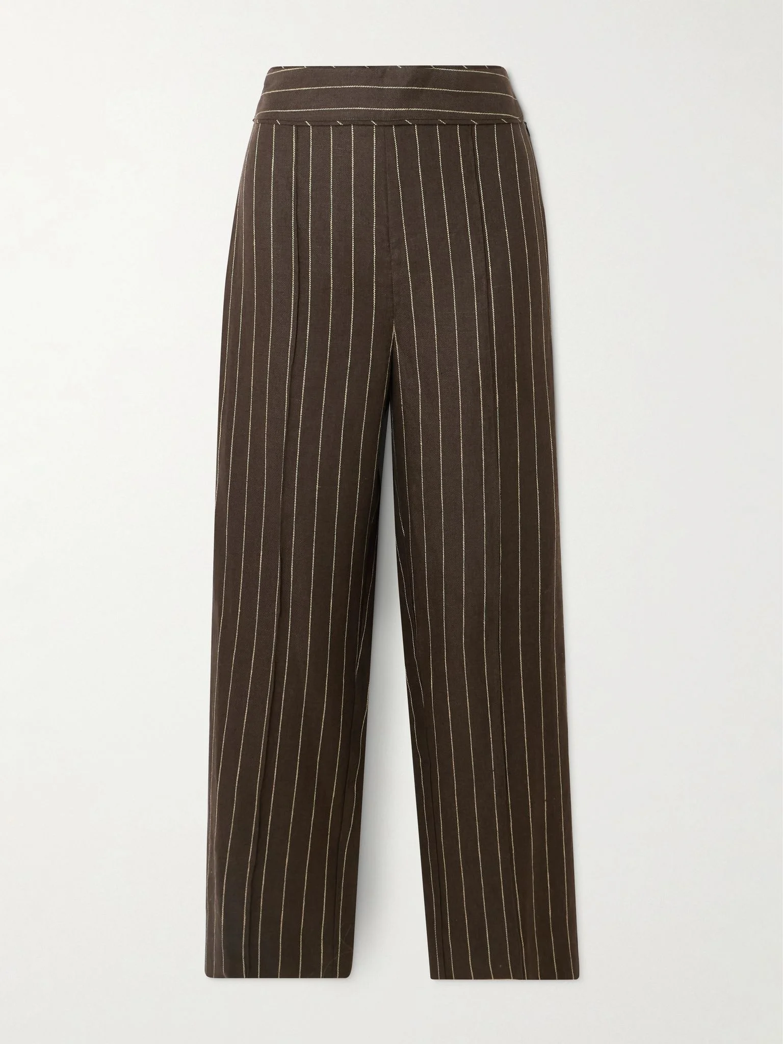 Posse's 'Thea' trousers are cut from certified linen-twill, making them a great choice for warmer weather. They're patterned with pinstripes and have sharp pleats for subtle volume. Wear yours with the coordinating blazer. Lower-Impact Materials. This product is made using at least 50% lower-impact materials or ingredients. Find out more about our NET SUSTAIN criteria here. Size & Fit - Fits true to size, take your normal size - High-rise, cut for a straight-leg fit - Mid-weight, non-stretchy fabric - Model is 175cm/ 5'9" and is wearing a size Small Model measurements: - Bust: 81cm/ 32” - Waist: 61cm/ 24” - Hip: 87cm/ 34” Details & Care - Dark-brown and cream linen-twill - Button, concealed hook and zip fastening at side - 100% linen - Designer color: Chocolate Cream