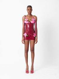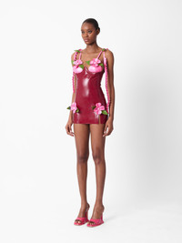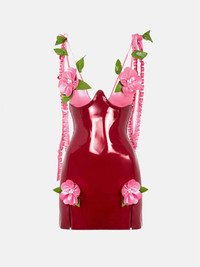 The Annamaria dress famously made its debut in NYC on POSTER GIRL JT. Expertly handcrafted in London with luxurious soft latex, featuring delicate pink flowers and green petals positioned over the bust and thighs, beaded pearls, underwire for full support and intricate pleated ties. Don't forget to use the latex wipe to give it that extra shine. As seen on JT @thegirljt. Pair with the Ursula Mules in Patent Pink for the complete look. - Ultra shine - Intricate pleated ties - Hand crafted flowers & petals - Pearl beading - Back zipper - 100% Latex - Model wears size S - Model Height: 5'9.5"/ 176cm