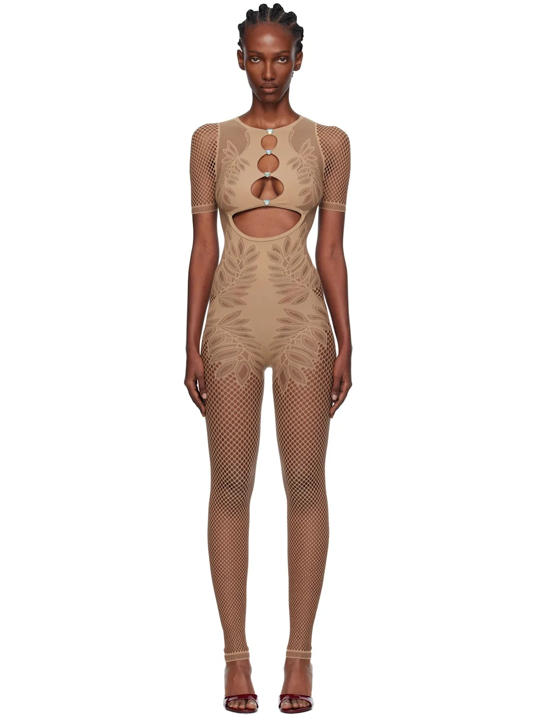 Stretch fishnet jumpsuit. · Semi-sheer · Pointelle-knit floral pattern throughout · Round neck · Keyhole cutouts with crystal at chest · Button closure with crystal at back collar · Jacquard logo at back Supplier color: Beige 45% polyamide, 43% polyester, 12% elastane. Made in Italy 252770F070012