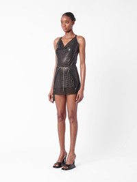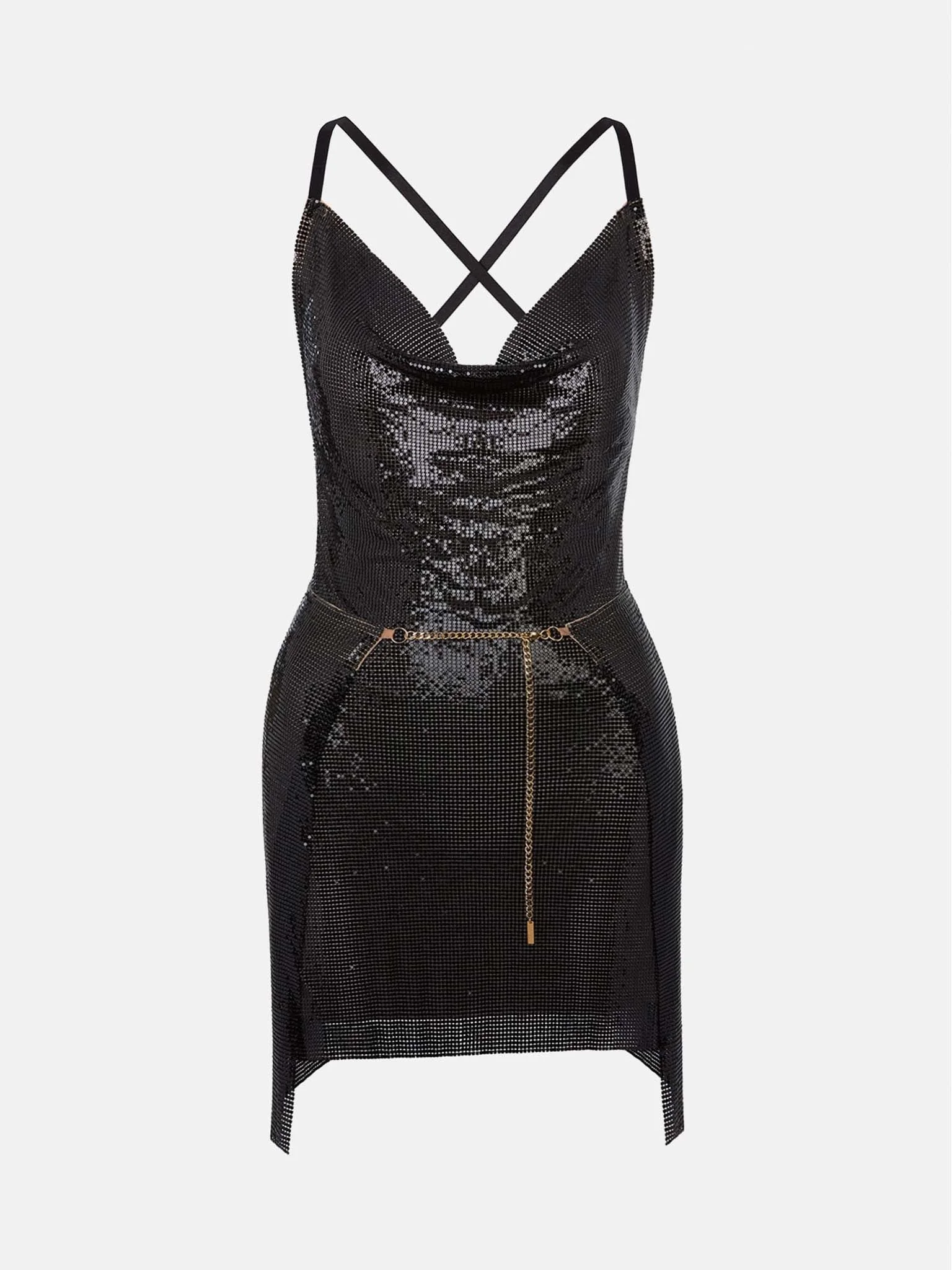 The Adrianne Mini Dress is a classic style featuring a double wrap skirt panel revealing splits on both thighs. The dress can be worn 3-ways with adjustable plush bra straps. Silver plated hardware fastens the skirt, and can be adjusted for the perfect fit. - Outer - 100% Aluminium - Lining - 95% Polyamide 5% Elastane - Model is 5'9"/ 175cm and wears size Small SUSTAINABILITY This POSTER GIRL piece is made in London 1 mile from our studio. Each chainmail piece is constructed by hand in London. Chainmail is unlike most fabrics so it is important to take care when trying on. Chainmail ranges from XS-XL and does not stretch. Never force the garment on otherwise the chainmail will rip. If you are in-between sizes, we recommend sizing up. COMPOSITION & CARE - Outer: - 100% Aluminium - Lining: - 95% Polyamide 5% Elastane