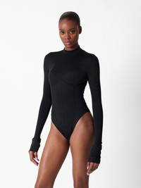 Tap into your feline fantasy in the Cat Call bodysuit. Part of our brand new padded shapewear category, the innovative body-contouring and ruched detailing will sculpt your figure like never before, with or without the removable padding for extra support. Features interior corsetry that cinches you in at the waist. With sleek proportions and a sultry jet-black fabric, she can be as styled up or as dressed down as you like. - Removable breast padding - Long sleeves - Ruched bum detailing - High round-neckline - Bra fastening behind the neck - Back-centre zip - Model wears size XS