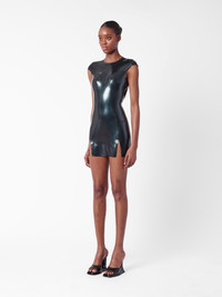 Hate the game, not the player. Our Player Latex T-Shirt Mini Dress has capped sleeves and an open back, with poppers on the neck, fastening to give a snatched fit. We designed two slits and style lines down the front to contour the body and make you the centre of attention. The centre back zip is concealed and runs from the mid back to the hem of the skirt. Pair with the Cruella Shoes in Patent Black for the complete look. Don't forget to use the latex wipe to give it that extra shine - Ultra shine mini dress - Capped short sleeves - Two front leg slits - Open back detail - Center back zipper with poppers on neck fastening - High round neckline - 100% latex - Models wears size S - Model Height: 5'10 178cm