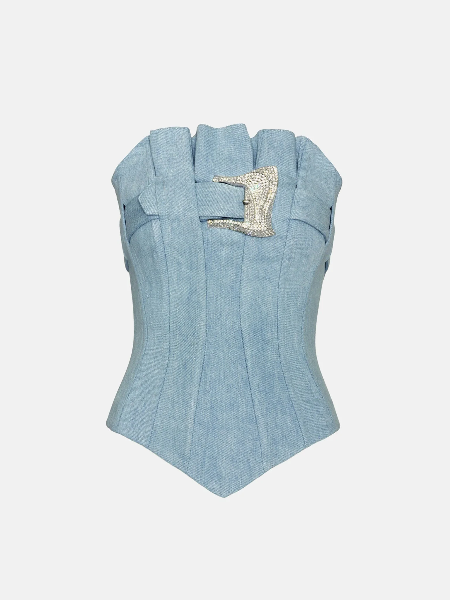 DESCRIPTION The Calamity Corset marks our denim debut. Crafted in London in luxurious light blue cotton, the denim corset features panelled pleating details, with silicon boning, that suction you in all the right places, highlighting your natural curves. Our iconic dazzling diamante buckle secures the pleated panels weaving in and out of the top hem. - Pair with the Dallas Micro Skirt for the full denim look - Pleated panelling - Boning channels - Diamante buckle belt - Centre back zip fastening - 100% Cotton