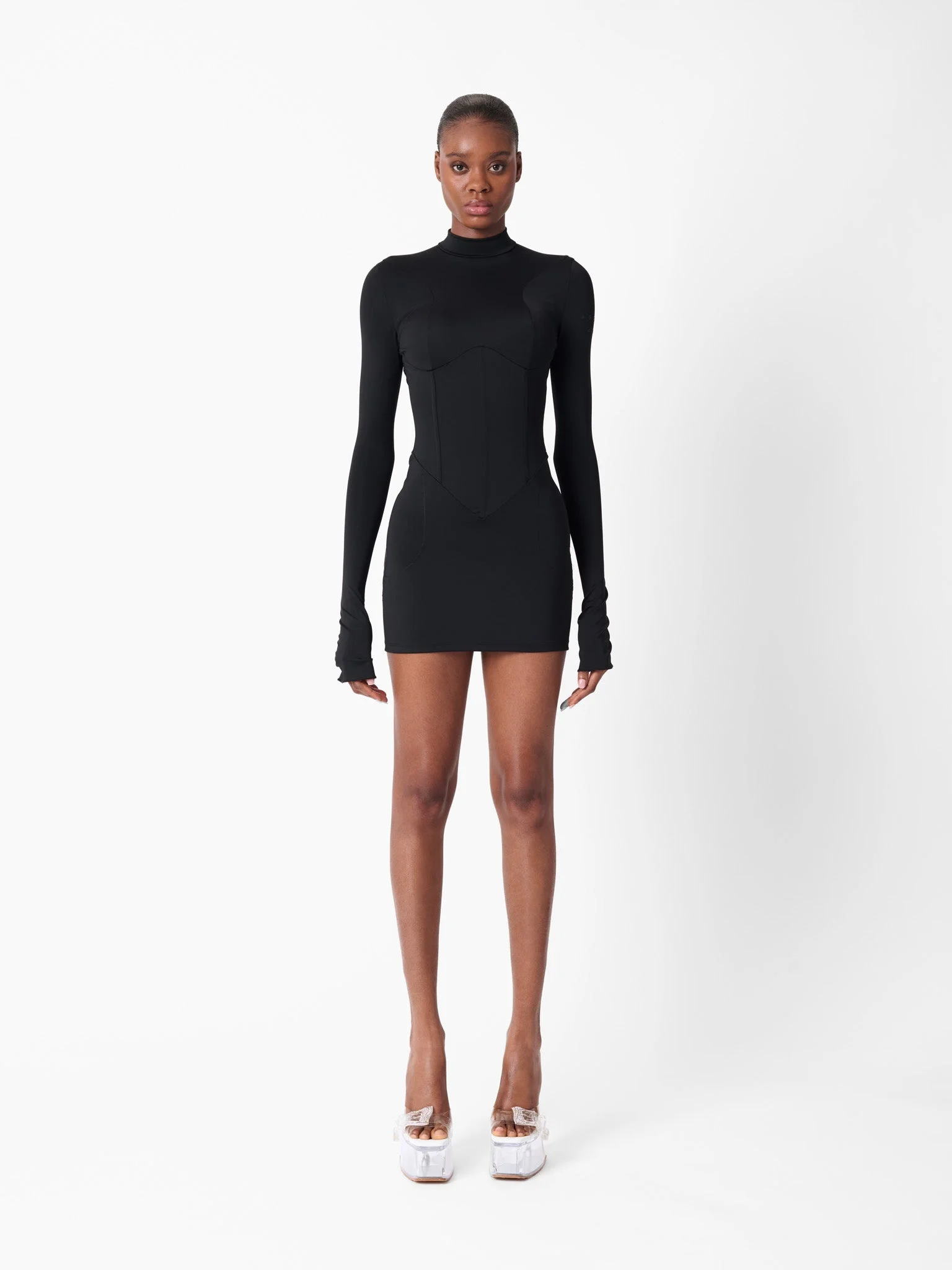 There's no going under the radar in the Cat Call mini-dress. Part of our brand new padded shapewear category, the innovative body-contouring and ruched detailing will sculpt your figure like never before, with or without the removable padding for extra support. Features interior corsetry that cinches you in at the waist. With sleek proportions and a sultry jet-black fabric, she can be as styled up or as dressed down as you like. - Removable breast, bum and hip padding - Long sleeves - High round-neckline - Ruched bum detail - Bra fastening behind the neck - Back-centre zip