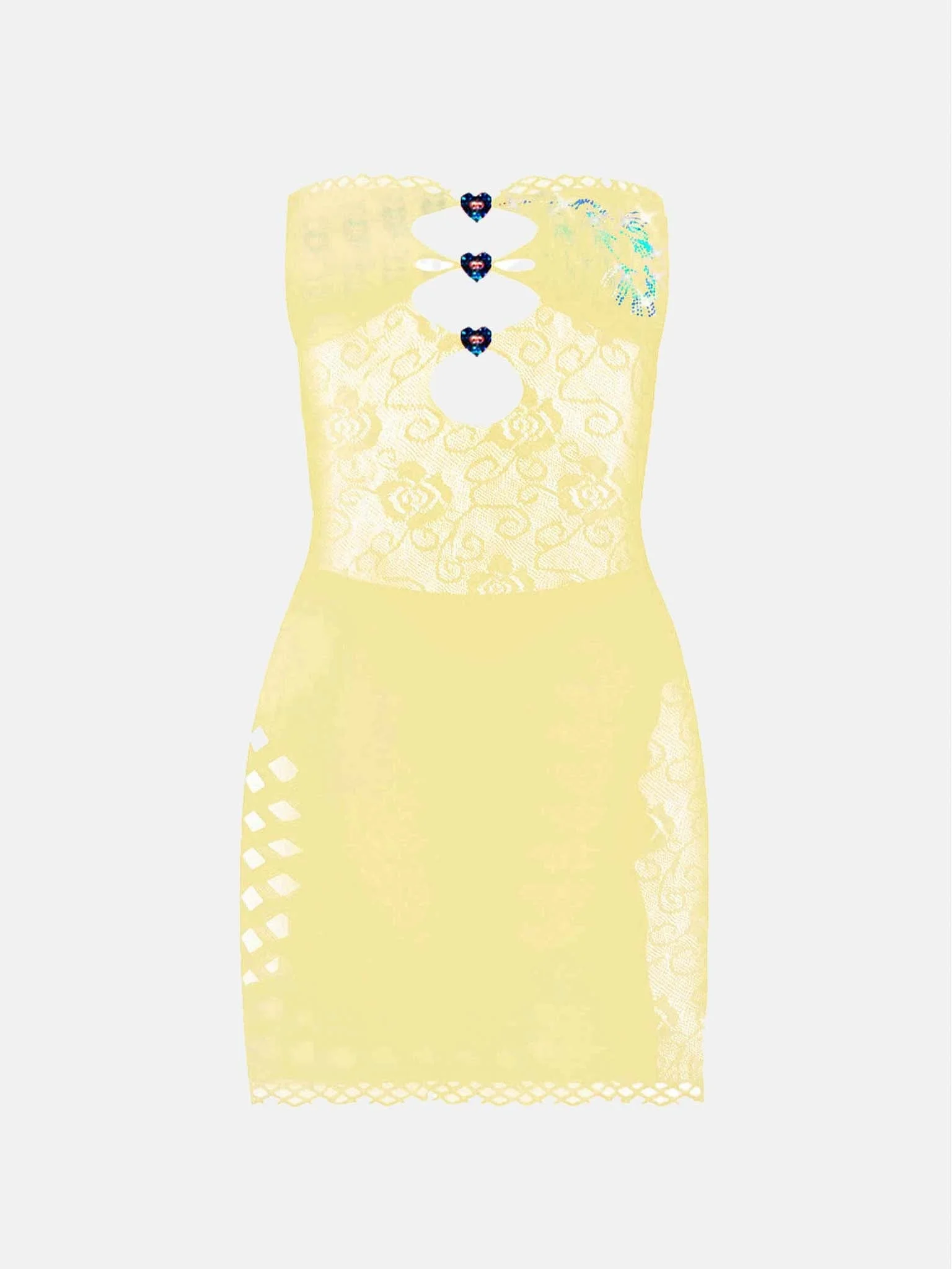 This bandeau dress features beautiful detailing including our brand new diamond cut open weave lace. With cut-out heart crystal embellishments this is the perfect mini dress for date night, girls night out or vacay evenings. POSTER GIRL's shapewear category is designed to suction you in all the right places, releasing and supporting your natural curves where needed. Always remember, the brand logo is stamped into the lower back of all shapewear designs as POSTER GIRL's mark of authenticity. - The dress is one size fits most (UK 6-18) - 98% Nylon 2% Spandex - Pair with our Nuclear Bow Earrings Gold - Heart embellishment repair kit included - Model Height: 5'7"/ 170cm