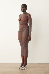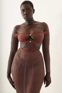 Make a statement in the Coolidge Top in Old Money Brown. This off the shoulder crop top features a peephole design and heart buttons for a touch of elegance. Pair it with our raven shorts or fortune skirt to complete the look. Its intricate eagle motif is inspired by our SS24 campaign, giving you a luxurious and exclusive feel. - Designed in London, Made in Italy - Sculpting hosiery shapewear - Eagle feather motive - Crystal Heart Buttons - 88% Polyamide, 12% Elastane - Model Height: 5'10 1/2"/ 179.5cm