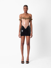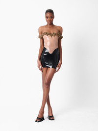POSTER GIRL's Fantasy dress is truly dreamlike. Meticulously hand-crafted, gold latex roses drape off the shoulder and around a transparent bust and midriff nipped in to bring your fantasy to life. The final touch? Gleaming black latex that brushes the thigh. Don't forget to use the latex wipe to give it that extra shine. Pair with the Ursula Mules in Patent Black for the complete look. - Ultra shine off the shoulder mini dress - 100% Latex - Hand crafted gold latex flowers - Center back zip fastening - Model wears size XS - Model Height: 5'9.5"/ 176cm