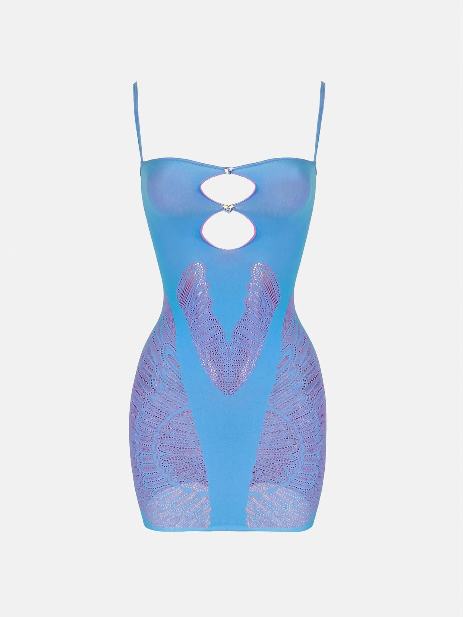 Indulge in opulence with our Gisele Dress in Crypto Blue. This bodycon dress features a mesmerizing eagle wing motive, adding an air of mystique to your ensemble. Made with luxurious opaque illusion fabric, this dress will hug your curves in all the right places. Elevate your look with this sophisticated and exclusive piece. - Designed in London, Made in Italy - Sculpting hosiery shapewear - Eagle feather motive - Crystal Heart Buttons - 88% Polyamide, 12% Elastane - Model is 5"7 /170cm