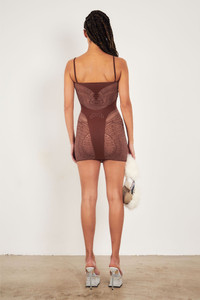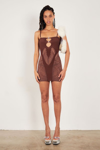 Indulge in opulence with our Gisele Dress in Old money brown. This bodycon dress features a mesmerizing eagle wing motive, adding an air of mystique to your ensemble. Made with luxurious opaque illusion fabric, this dress will hug your curves in all the right places. Elevate your look with this sophisticated and exclusive piece., - Designed in London, Made in Italy - Sculpting hosiery shapewear - Eagle feather motive - Crystal Heart Buttons - 88% Polyamide, 12% Elastane - Model is 5"11 /180cm