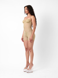 Cut from a semi sheer gloss fabric, this body-skimming playsuit has been designed to accentuate your body in all its glory, accompanied by spaghetti straps that can be adjusted to your preferred fit. Pair with the Glass Slippers for the complete look. - Semi sheer gloss playsuit - Peekaboo button up front detailing - Adjustable spaghetti straps - Crystal Heart Buttons - Model wears size XS - Model Height: 5'8.5" / 174cm