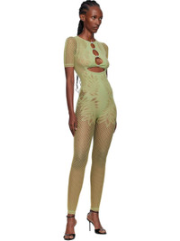 Stretch fishnet jumpsuit. · Semi-sheer · Pointelle-knit floral pattern throughout · Round neck · Keyhole cutouts with crystal at chest · Button closure with crystal at back collar · Jacquard logo at back Supplier color: Green 45% polyamide, 43% polyester, 12% elastane. Made in Italy 252770F070013