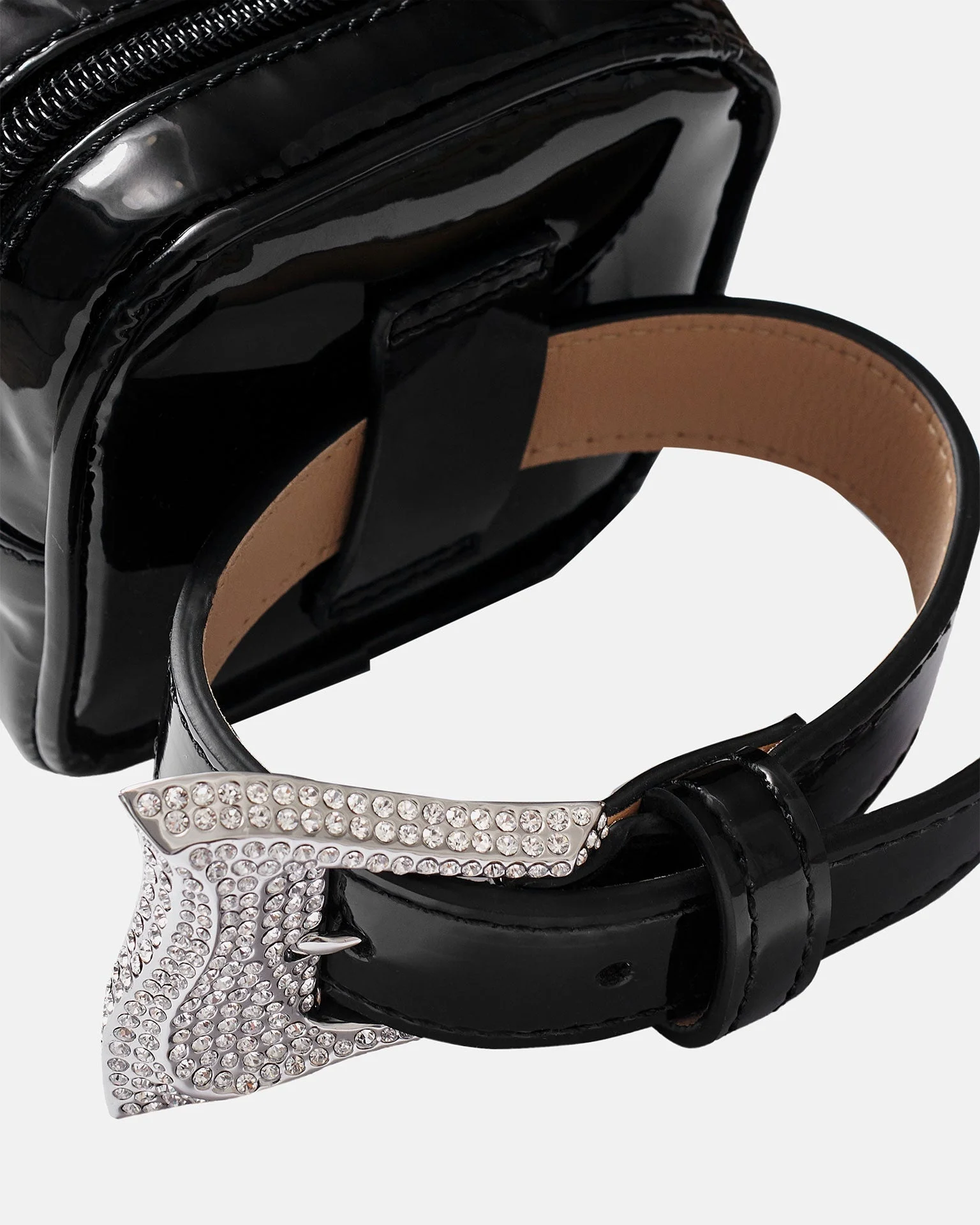 The Haus Purse Belt is the perfect accessory this season. The belt can be adjusted for the perfect fit and features our iconic custom diamante buckle & a petite zipped pouch to stow only the small essentials. Hand crafted in London in black patent leather, the Haus purse was designed to make an outfit statement. - 100% patent leather - Custom diamante encrusted buckle